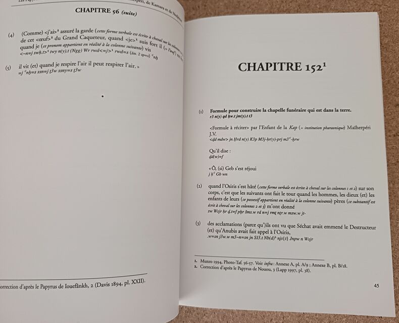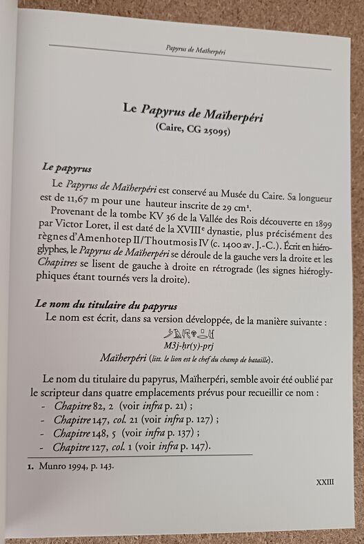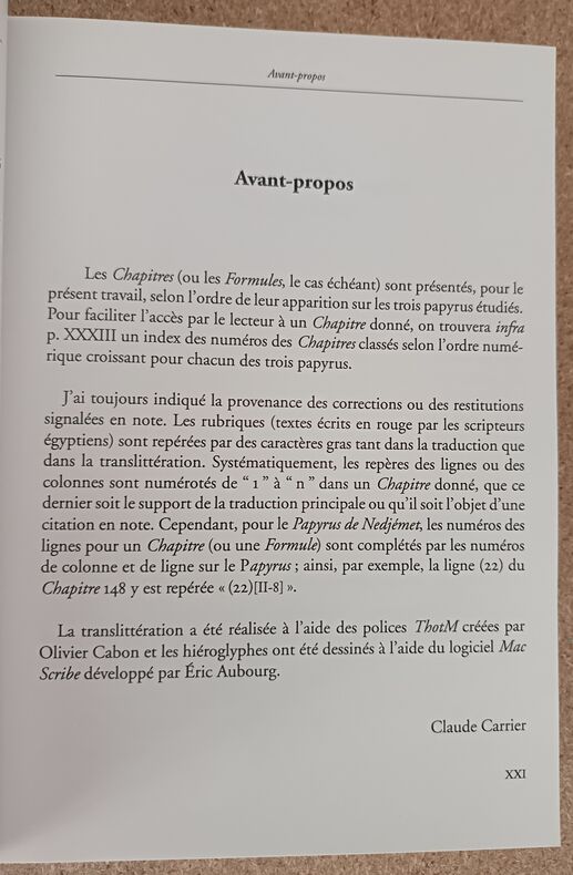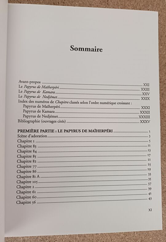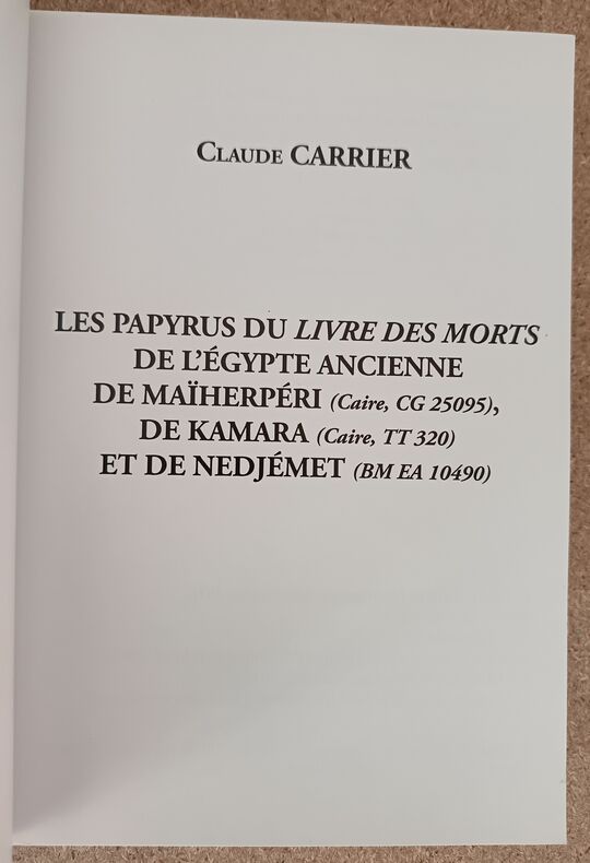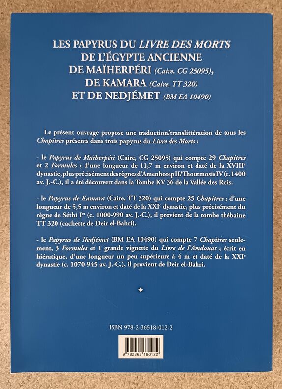 <p>Le présent ouvrage propose une traduction/Translittération de tous les "Chapitres" présents dans trois papyrus du "Livre des Morts":</p><p>- le "Papyrus de Maïherpéri" (Caire, CG 25095) qui compte 29 "Chapitres" et 2 "Formules"; d'une longueur de 11,7 m environ et daté de la XVIIIe dynastie, plus précisément des règnes d'Amenhotep II / Thoutmosis IV (c. 1400 av. J.-C.), il a été découvert dans la Tombe KV 36 de la Vallée des Rois.</p><p>- le "Papyrus de Kamara" (Caire, TT 320) qui comte 25 "Chapitres"; d'une longueur de 5,5 m environ et daté de la XXIe dynastie, plus précisément du règne de Séthi Ier (c. 1000-990 av. J.-C.), il provient de la tombe thébaine TT 320 (cachette de Deir el-Bahri).</p><p>- le "Papyrus de Nedjémet" (BM EA 10490) qui compte 7 "Chapitres" seulement, 3 "Formules" et 1 grande vignette du "Livre de l'Amdouat"; écrit en hiératique, d'une longueur un peu supérieure à 4 m et daté de la XXIe dynastie (c. 1070-945 av. J.-C.), il provient de Deir el-Bahri.</p> Brest, 2015 554 p., illustrations N/B, broché. 17,5 x 24