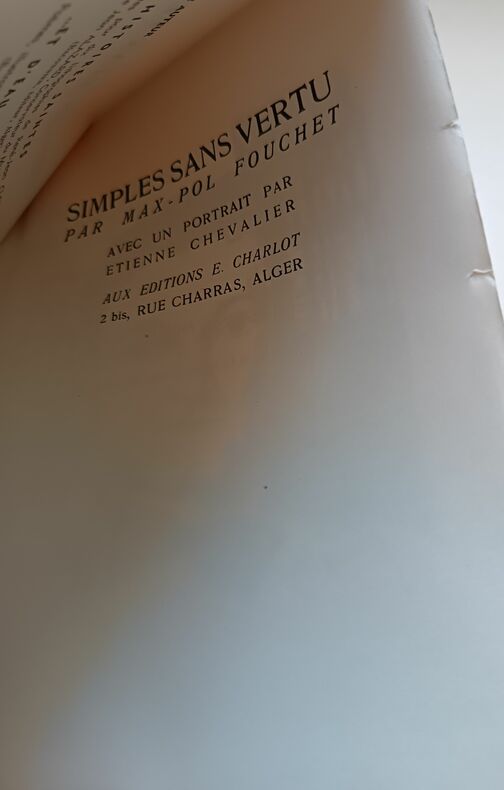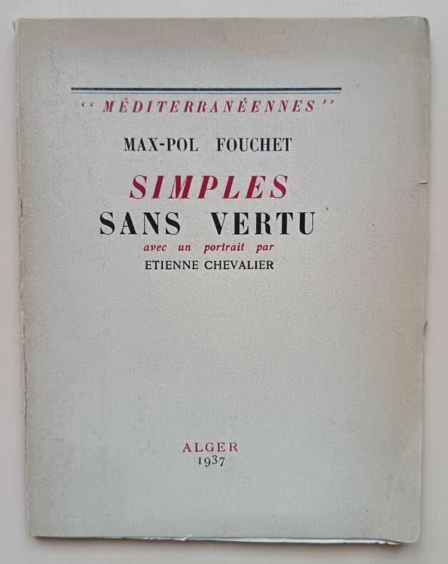 Ed. E. Charlot. Alger 1927 In-8 broché, 60 pp., Portrait d'Etienne Chevalier. Edition originale tirée à 400 exemplaires, un des 35 sur Turner. Couverture un peu jaunie. Une date manus. en garde.