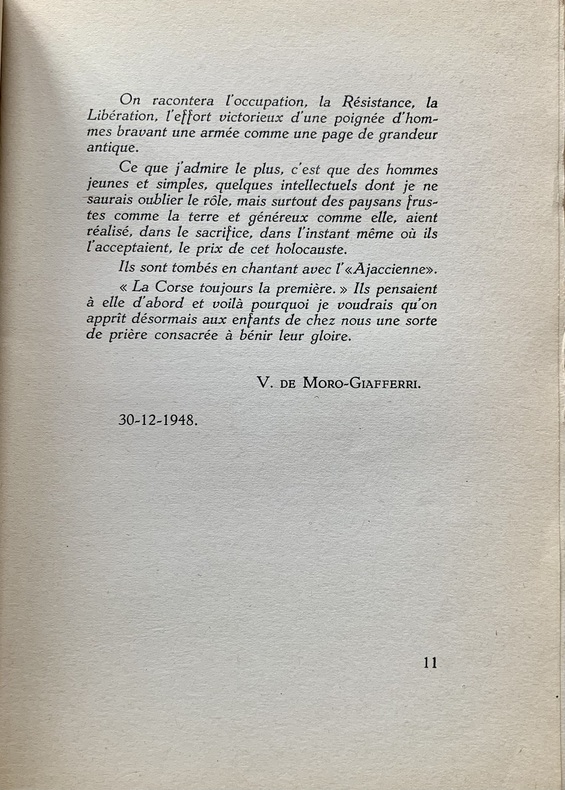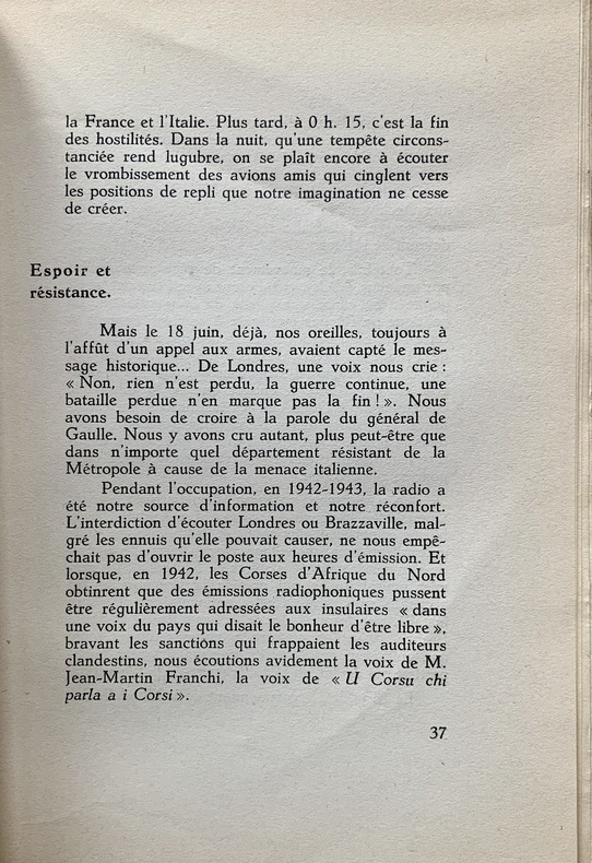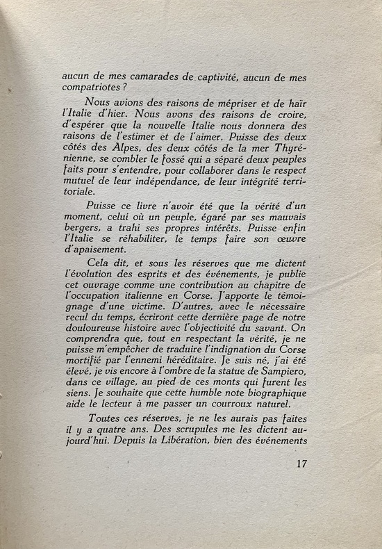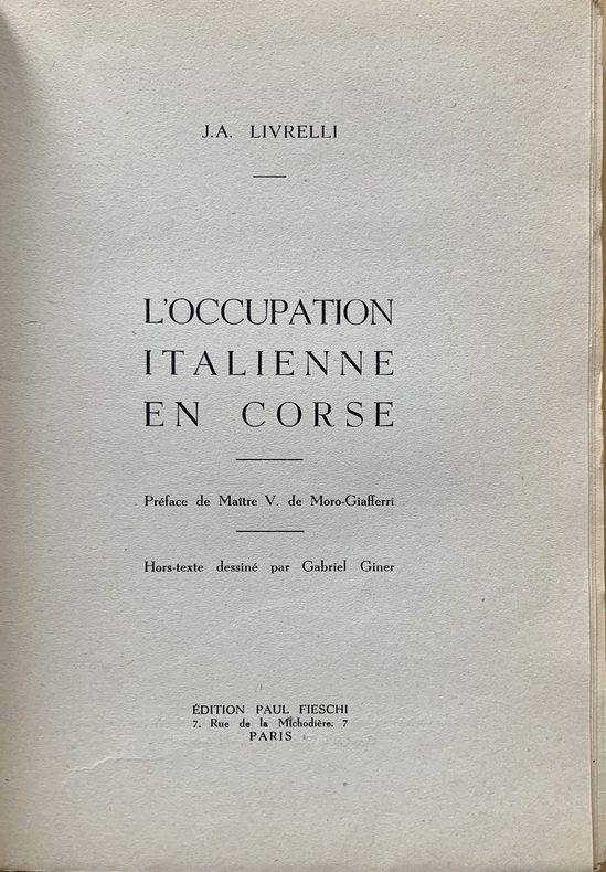 "En 1949, l’instituteur et rédacteur ajaccien du radical-socialiste "Le Journal de la Corse", Jean-André Livrelli (1874-1967), ancien déporté en Italie puis en Autriche, publie "L’occupation italienne en Corse". Cette violente charge italophobe consacre néanmoins ses quarante premières pages à expliquer – sous une forme plus « intuitive » que strictement historique mais très éclairante d’un point de vue anthropologique – la naissance du sentiment résistant dans la population insulaire. Viennent ensuite le récit – qui est davantage un témoignage – de la captivité des résistants corses déportés par les Italiens et enfin, une longue chronologie de la Libération de la Corse. Œuvre personnelle à plus d’un titre, son propos extrêmement « revanchard », représente une source incomparable pour ce qui est de la représentation mentale de l’Italien dans l’imaginaire social corse des années 1930-1940 et de son impact dans les processus de gestation du phénomène résistant et d’engagements personnels." (Sylvain Gregori, (Ré)écrire l’histoire de la Résistance corse, 2014)