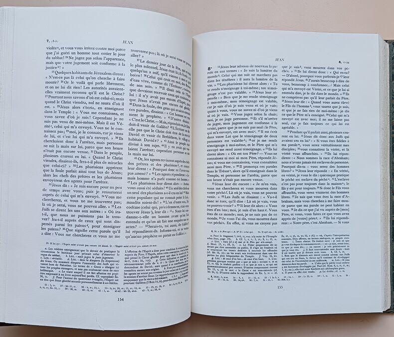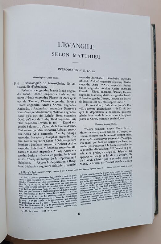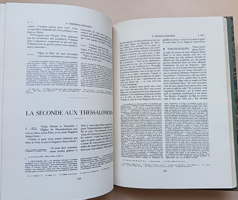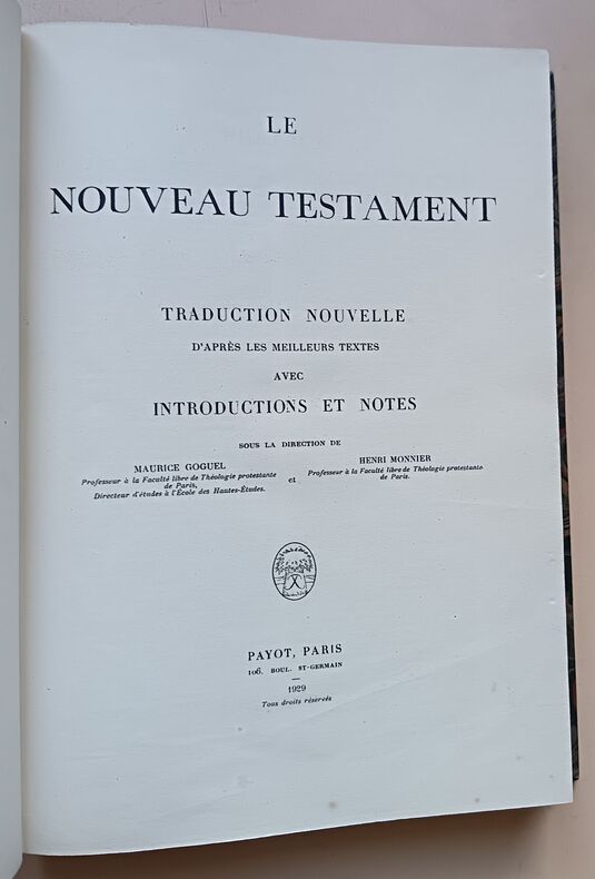 Edition à la même date que l'originale parue à l'adresse de Migeot à Mons en deux volumes. Elle reprend aussi le même frontispice dessiné par Philippe de Champaigue, mais gravé ici par Claude Burnand. Cette traduction du Nouveau Testament, dite de Mons avait été commencée par Antoine Le Maistre, continué par Antoine Arnauld et Louis-Isaac Le Maistre de Sacy. La préface est attribuée à Pierre Nicole et Claude de Sainte-Marthe. La publication du reste de la Bible se poursuivra jusqu'en 1696, accompagnée de "grandes explications" et de "courtes notes", même si le Nouveau Testament avait été mis à l'index peu après sa parution. (Brunet V, 749).La présente édition a été clairement identifiée comme une contrefaçon lyonnaise de l'imprimeur Antoine Jullieron dans une étude de 1987 : BONNEFON Christine, COME Delphine, DESSERVETTAZ Kari, MANFRIN Frédéric, SILLET Arnauld-Amaury : "Contribution à l'identification de quelques contrefaçons de la fin du XVIIe siècle : l'exemple du Nouveau Testament dit de Mons". Enssib.fr/ bibliothèque numérique. Mémoire de recherche. 2004.