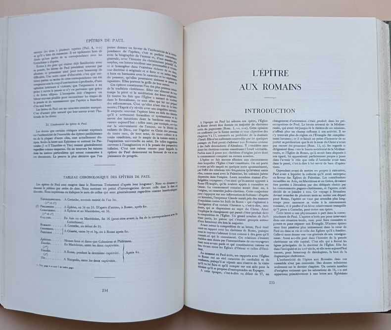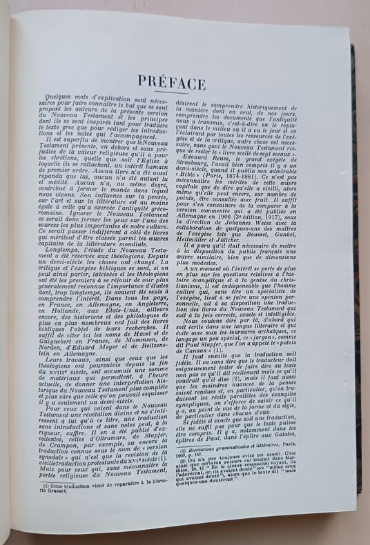 David Martin ((1639-1721) était originaire de Revel en Haute-Garonne. Après des études de théologie à Puylaurens, dans le Tarn, il devient pasteur mais doit quitter la France face aux persécussions de Louis XIV. Il officia alors comme pasteur à Utrecht (jusquà sa mort, à 82 ans), et entreprit une nouvelle traduction française de la Bible à partir des textes originaux en hébreux. Son "Nouveau testament, expliqué par des notes courtes et claires" est achevé en 1696. A la suite, le synode des églises wallonnes lui demande de réviser la Bible de Genève de 1669, qui était une révision de la bible dOlivétan (1535) par Jean Calvin (en 1560) et Thodore de Bèze (en 1588).Sa Sainte Bible est achevée en 1707 et publiée la même année à Amsterdam en 2 volumes in-folio. Après sa mort, un autre pasteur de Bâle, également originaire du Tarm, Pierre Roques, entreprendra une révision entre 1736 et 1744. Enfin, c'est J.-F. Ostervald qui révisa une dernière fois le texte en 1744. Chaque révisions ne portait pas sur le fait de restituer ou corriger le sens original, mais plutôt de moderniser et simplifier le style pour le rendre accessible à tous. Notre exemplaire contient les Livres apocryphes (palcés entre l'Ancien et le Nouveau Testament, qui n'étaient pas dans l'édition revue par Pierre Roque en 1744.