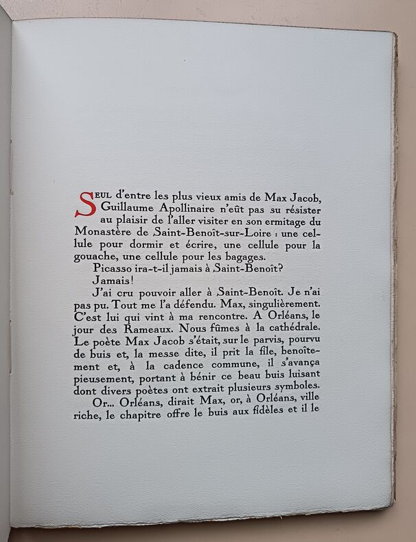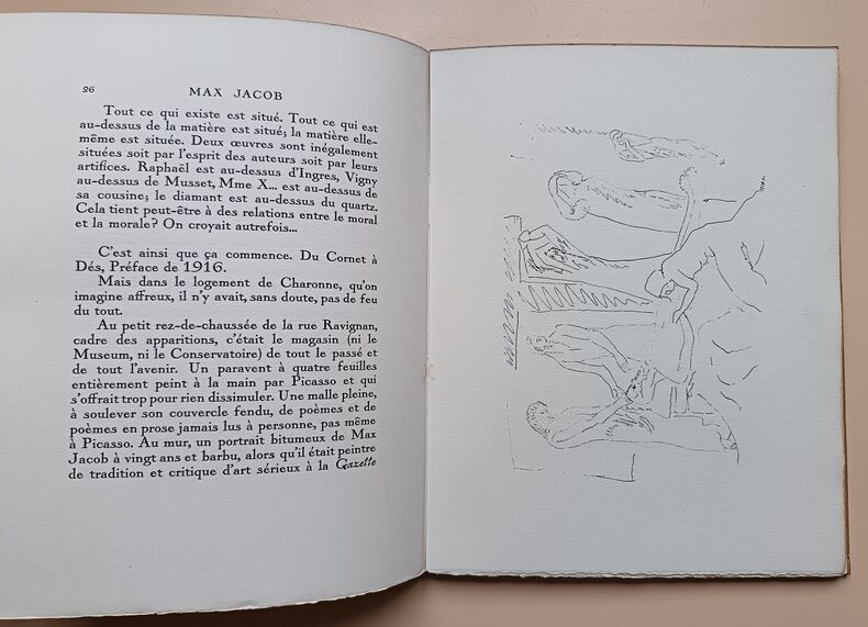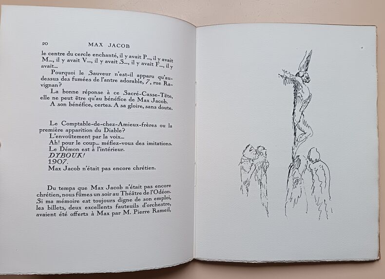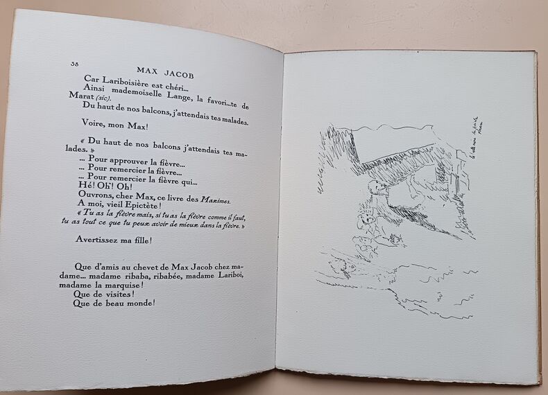 Paris René Girard, Editeur 1927 in 4 (29x22,5) 1 volume in 4 reliure demi chagrin maroquiné brique à coins, dos lisse, couverture conservée, portrait de Max Jacob par Kisling en frontispice, 58 pages [1], avec et 9 dessins hors-texte de Max Jacob. Edition originale. Tirage limité à 525 exemplaires, celui-ci un 475 exemplaires numérotés sur Vélin d'Arches à la forme. Ex-libris du peintre Marcel Parturier. Cet exemplaire est enrichi d'un beau dessin original à la plume à pleine page signé et accompagné d'une belle dédicace de Max Jacob à son ami Marcel Parturier. Bel exemplaire ( Photographies sur demande / We can send pictures of this book on simple request )