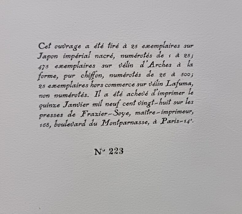 Ed. René Girard, 1927, 58pp, In-4. Bon état. Couverture souple rempliée éditeur sous papier cristal. (Légères traces d’usure, reliure fragile, dos en partie désolidarisé : voir photos). Intérieur très frais et très propre. Sans annotations ni phrases/illustrations soulignées. Voir photos. Un des 475 exemplaires sur vélin d’Arches à la forme, pur chiffon. Celui-ci, N°223.