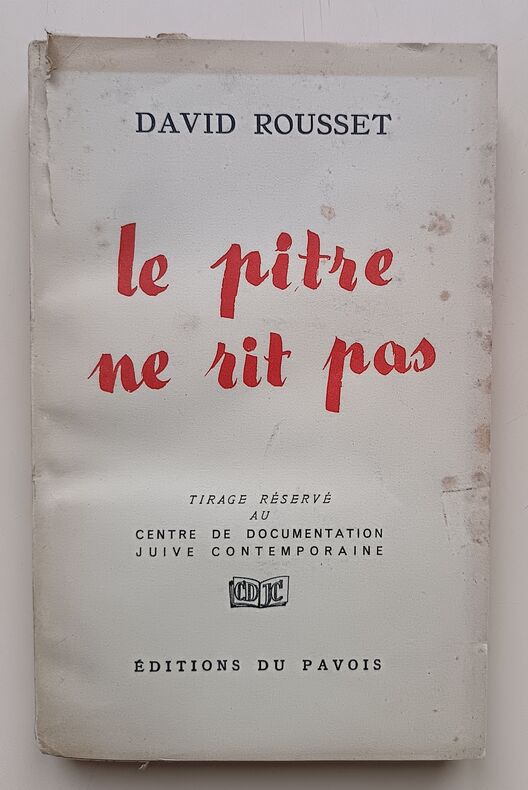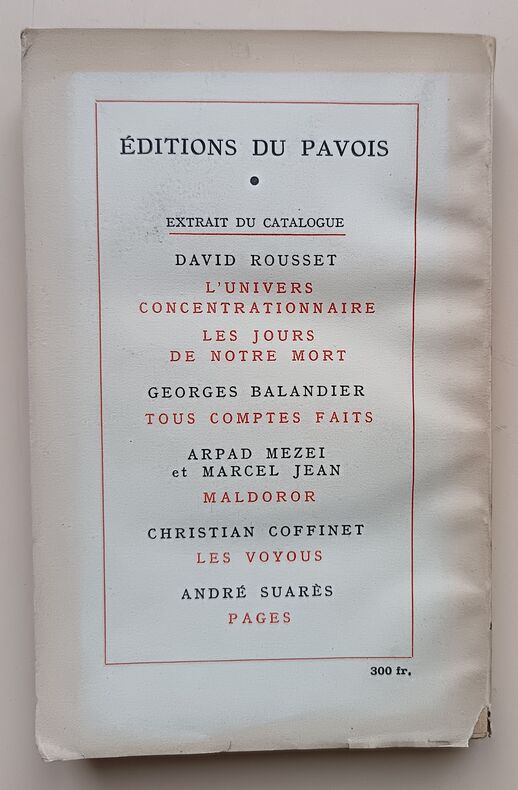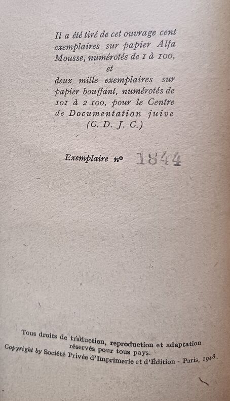 Editions du Pavois, 1948, 263pp, In-12. Assez bon état. Couverture souple éditeur. (Dos et contours insolés, rousseurs sur le premier plat, petite déchirure). Intérieur propre et assez frais. (Papier bruni, pages légèrement gondolées). Sans annotations ni phrases/illustrations soulignées. Voir photos. Un des deux mille exemplaires sur papier bouffant numérotés pour le Centre de Documentation Juive, celui-ci, Exemplaire n° 1844.