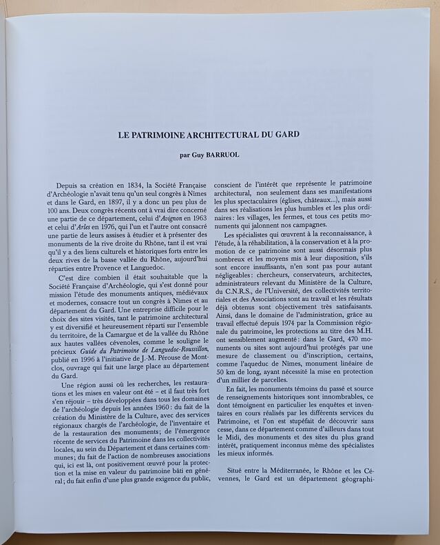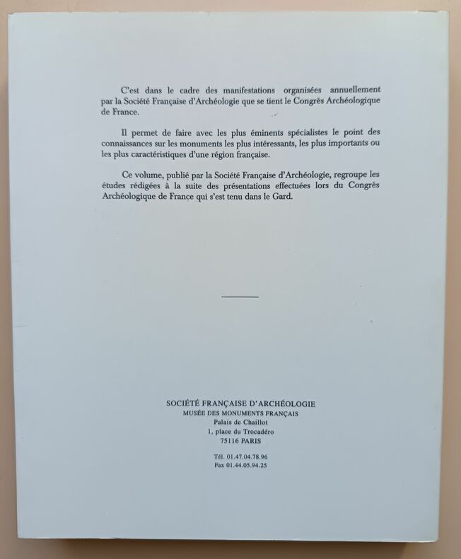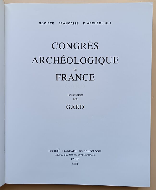 Paris Société Française d'Archéologie 2000 in 4 (27x22) 1 fort volume broché, couverture à rabats illustrée en couleurs, 537 pages [3], avec de nombreuses photographies en noir et blanc, et plans. Société française d'archéologie: Congrès Archéologique de France, 157e session 1999 MONUMENTS DU GARD. Très bel exemplaire ( Photographies sur demande / We can send pictures of this book on simple request )