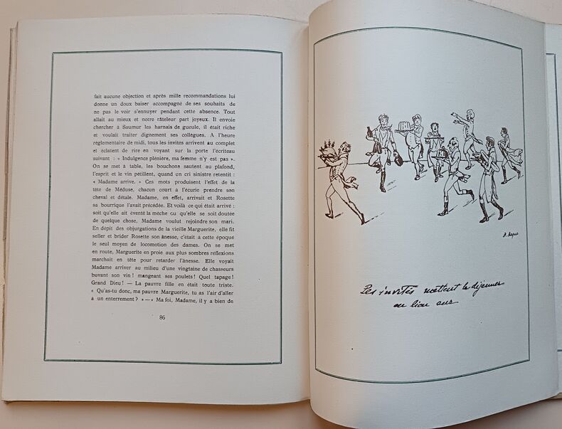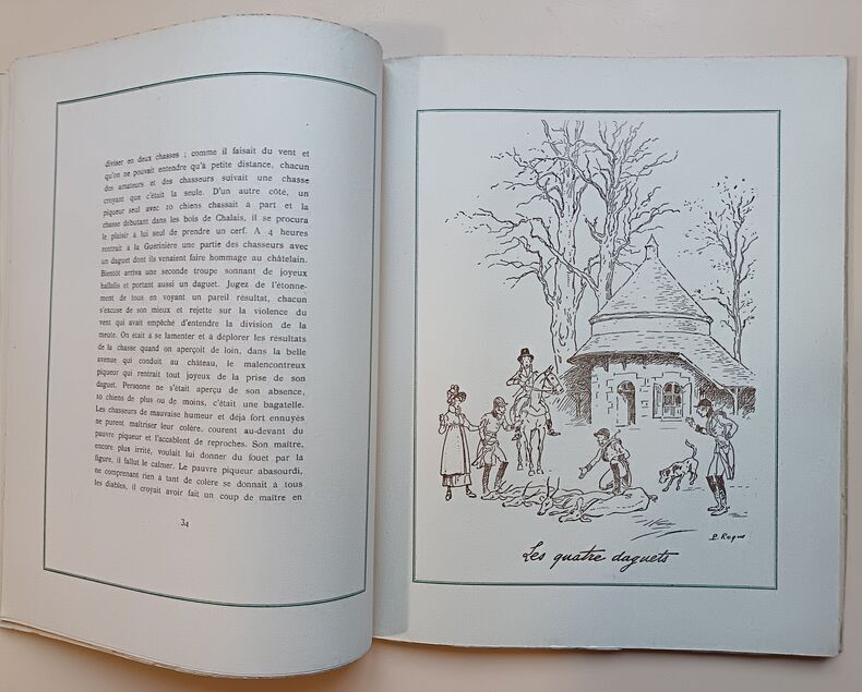 Chez Crépin Leblond éditeur, Moulins, 1947. In/4 broché, couverture illustrée, avec le dos restauré, 90 pages, illustrations à pleine page de Paul Roque. Texte et illustration encadrés d’un double filet vert. Exemplaire sur vélin édita.