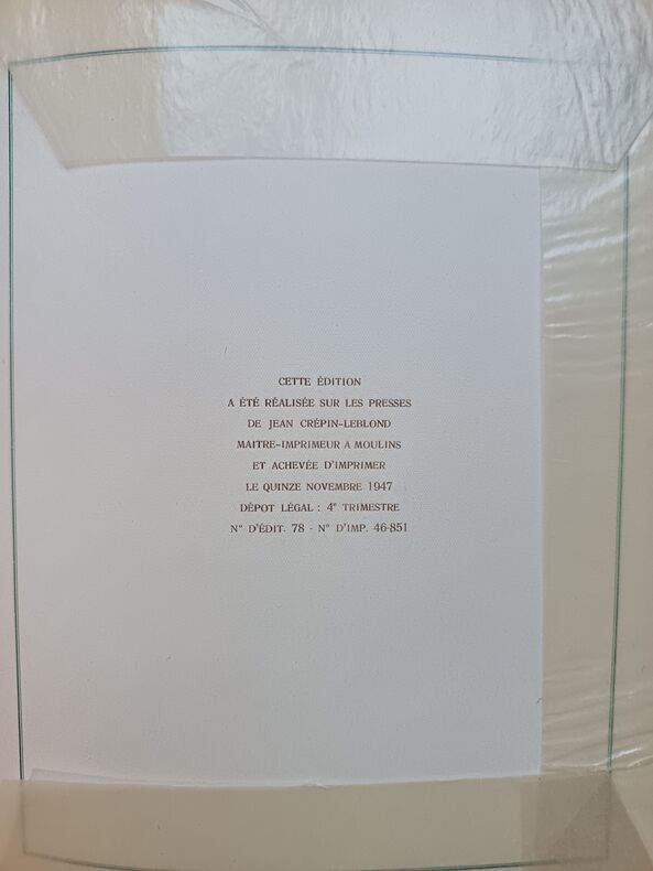 Moulins, Crépin-Leblond, 1947. In-4 broché de 90-[6] pages, couverture verte illustrée, imprimée en deux tons. Infimes accrocs sans perte aux bords de la couverture, marques d'un ancien papier de protection sur gardes.