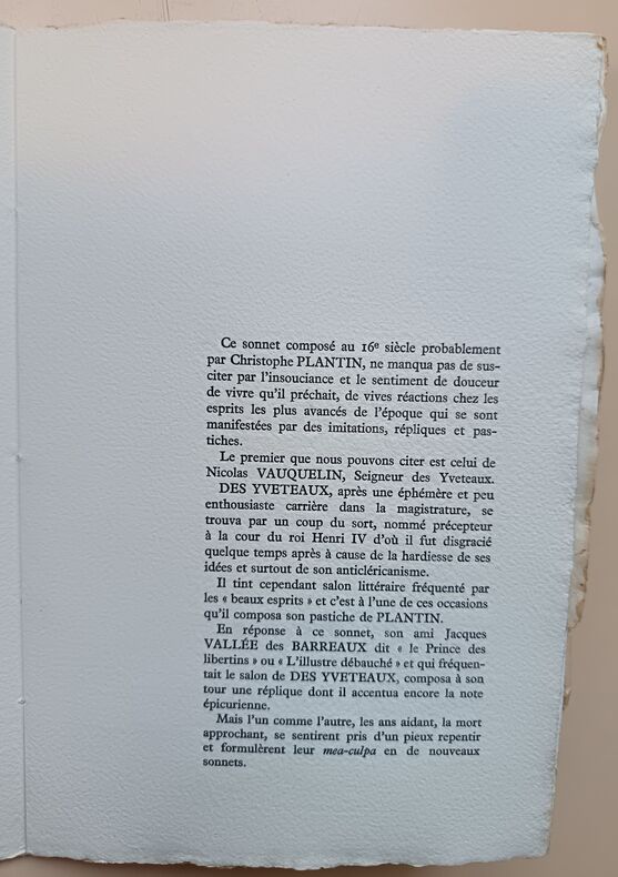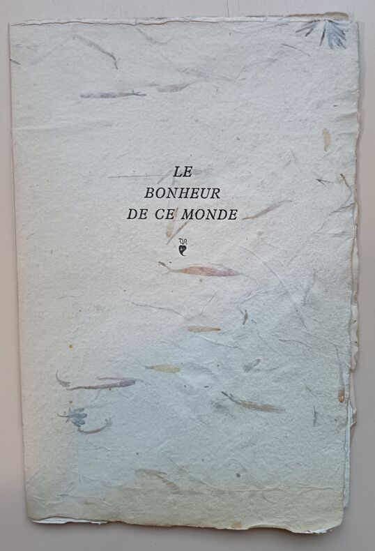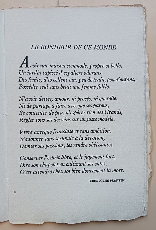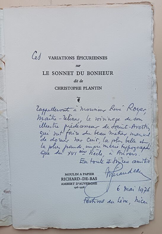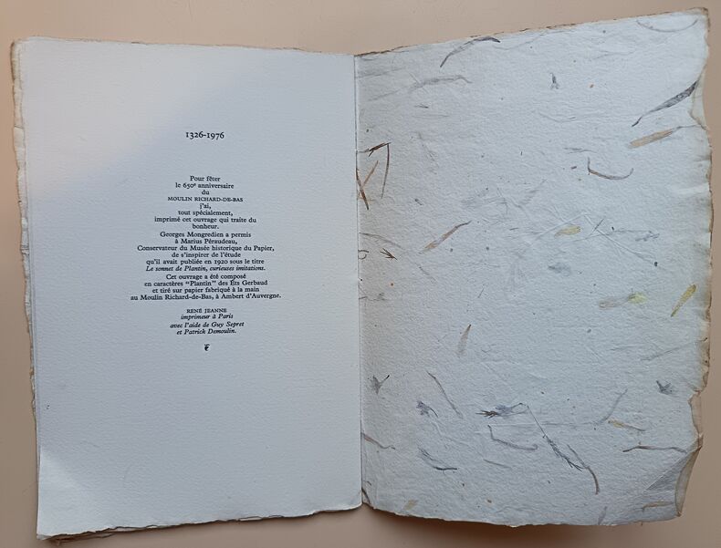 Ed. Moulin à papier Richard-de-Bas, 1976, non paginé, in-8. Très bon état. Couverture souple éditeur. Intérieur impeccable. Dédicace de Marius Péraudeau, conservateur du Musée historique du Papier en page de titre, sinon, sans annotations ni phrases/illustrations soulignées. Voir photos. Ouvrage composé en caractères "Plantin" des Éts Gerbaud et tiré sur papier fabriqué à la main au Moulin Richard-de-Bas à l'occasion de son 650e anniversaire.