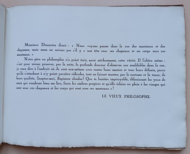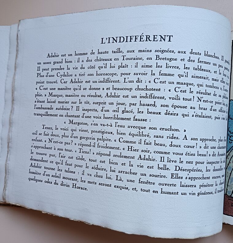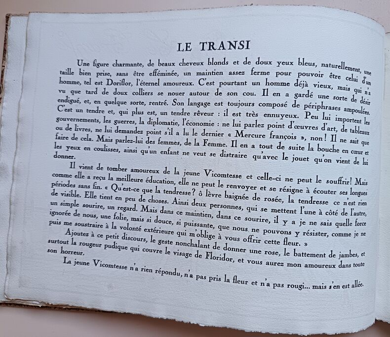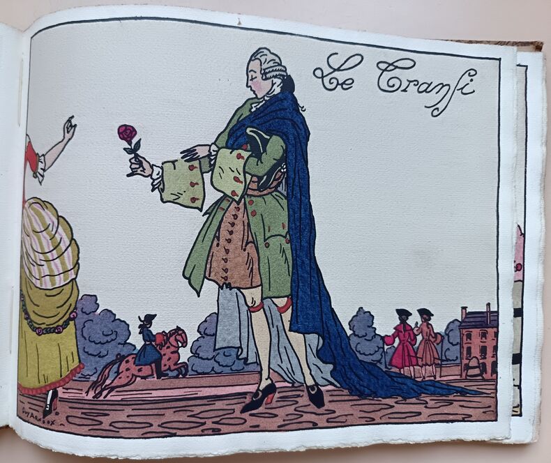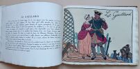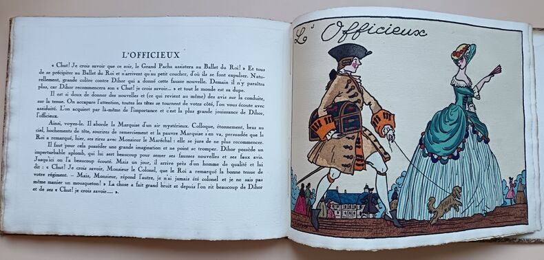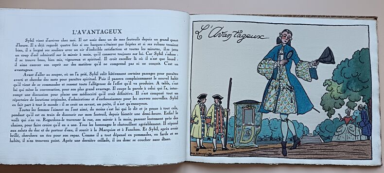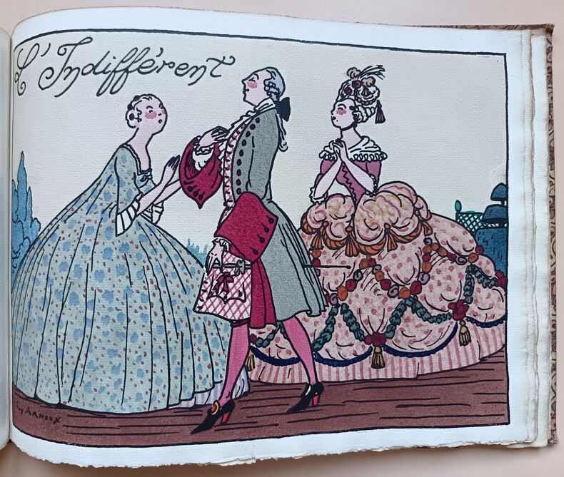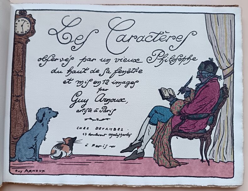 Paris, Devambez, s.d. (1920); in-4 à l'italienne, cart. bradel recouvert d'une toile fleurie, pièce imprimée sur le plat. (Reliure de l'éditeur). 28 pp. (texte). Titre illustré et 12 planches en couleurs. Guy Arnoux est le créateur d'un nouvel art populaire d'un caractère archaïque et moderne à la fois. Il reprend la technique de la gravure sur bois coloriée au pochoir. Les caractères représentés ici sont le gaillard, l'aventureux, le déterminé, le transi, l'impatient, l'empressé, l'avantageux, le jaloux, l'indifférent, le fâcheux, l'indiscret, l'officieux. Les scènes se déroulent sous le Règne de Louis XV. Tirage limité à 500 exemplaires numérotés. Celui-ci sur papier Ingres d'Arches porte in-fine la signature de l'éditeur.