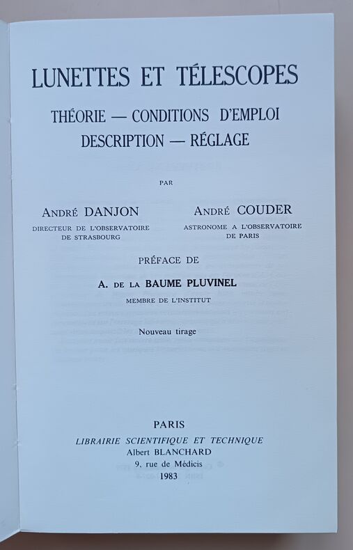 ---- EDITION ORIGINALE ---- BEL EXEMPLAIRE bien complet de ses 14 PLANCHES hors texte ---- "A. Danjon prend en 1945 la direction de l'Observatoire de Paris puis de l'Institut d'astrophysique. L'astronomie de position lui doit divers instruments de haute précision notamment un nouvel astrolabe permettant des observations impersonnelles et un interféromètre à lame demi-onde... Parmi ses oeuvres figurent deux ouvrages de référence... Lunettes et télescopes écrit en collaboration avec A. Couderc"**1500/L3-5952/ARB1