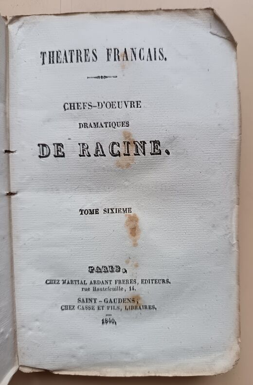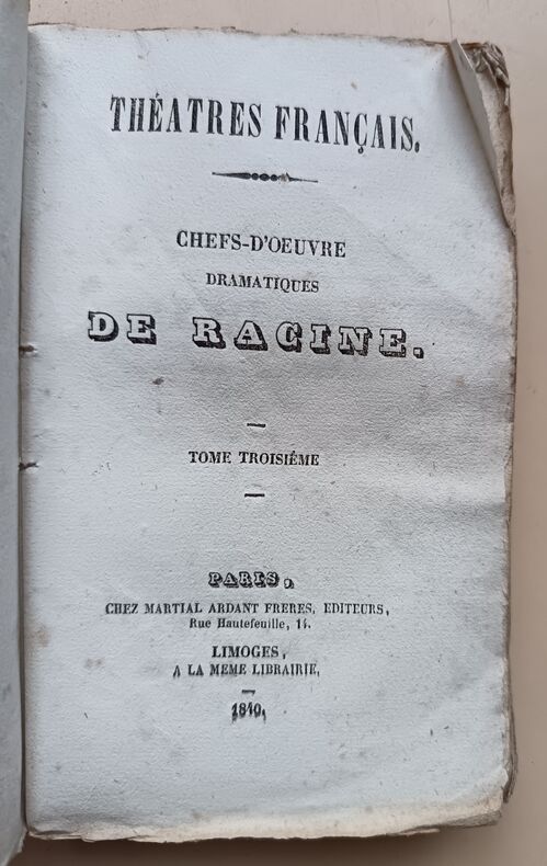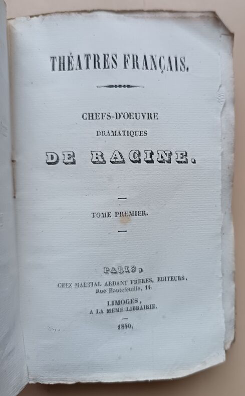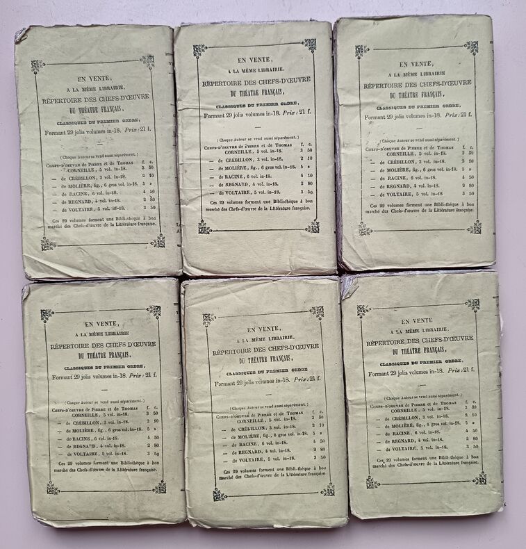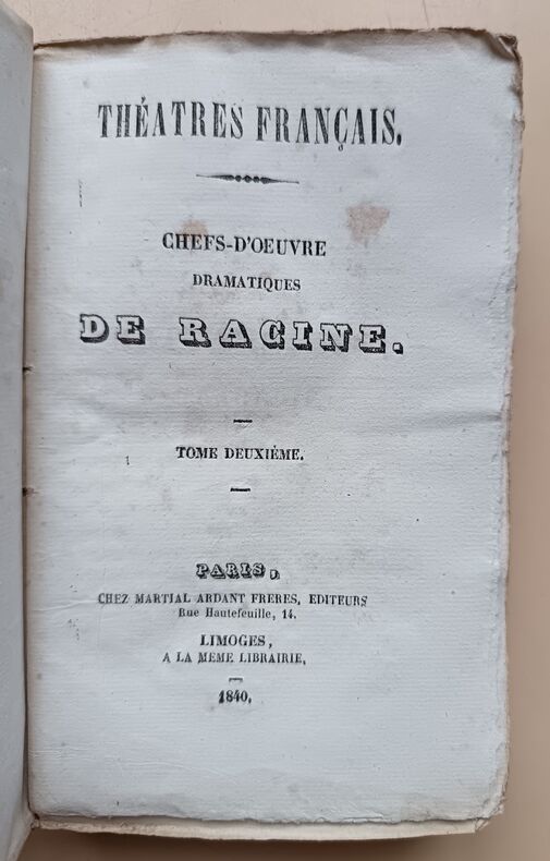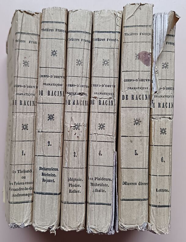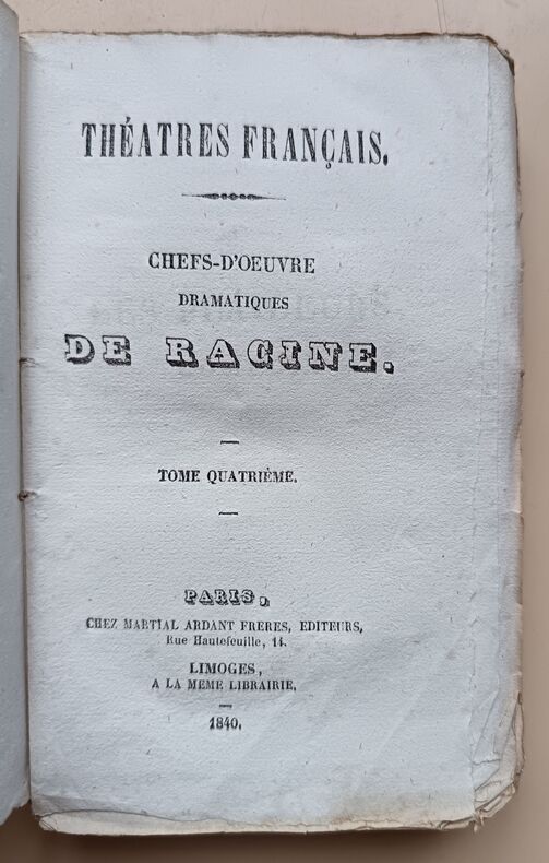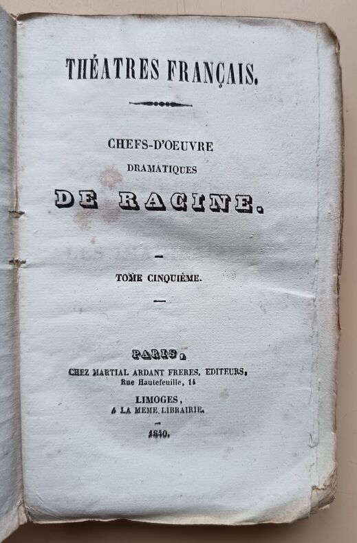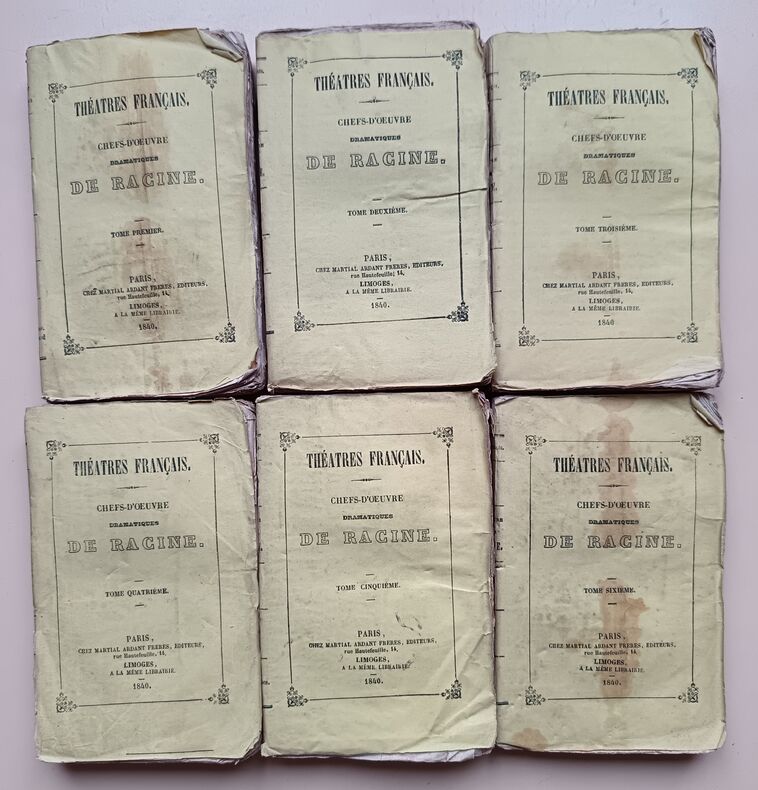 Ed. Chez Martial Ardant Frères, 1840, 246-269-248-259-283-214pp, In-16. Bon état. Défaut concentrés sur les couvertures défraîchies et présentant de nombreuses traces d'usure. Intérieurs très frais et très propres, pages bien blanches. (De très légères rousseurs). Sans annotations ni phrases/illustrations soulignées. Voir photos. Très rare ensemble complet.