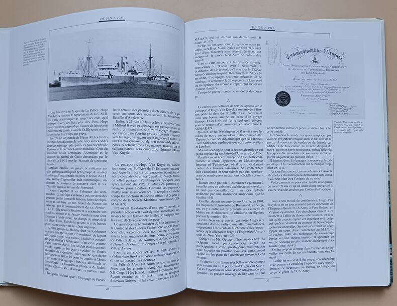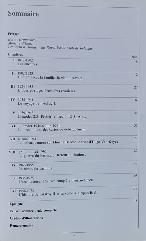 Editions de la Dyle, Bonheiden, 1988. In-4, reliure pleine toile éditeur, titre doré sur le plat supérieur et le dos, 148 pp. Préface, par le Baron Kronacker, ministre d'Etat, président d'honneur du Royal Yacht Club de Belgique - Chapitre 1. 1812-1902. Les ancêtres. - 2. 1902-1923. Une enfance, la famille, la ville d'Anvers. - 3. 1924-1935. Etudes et stage. Premières croisières. - ...