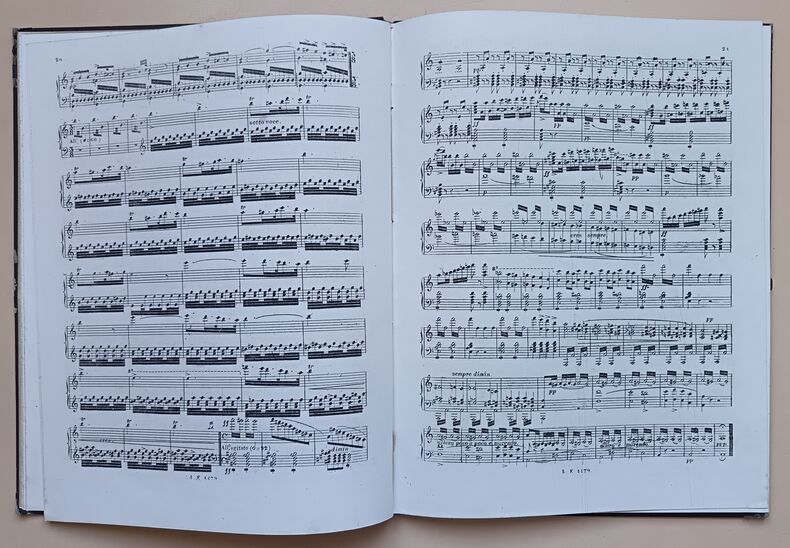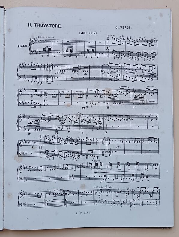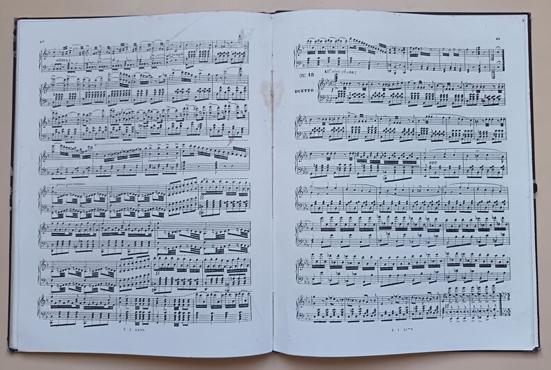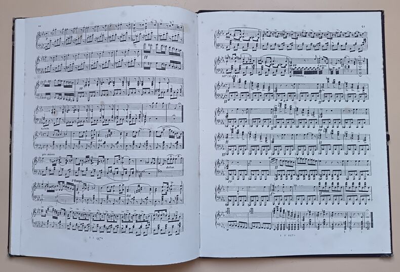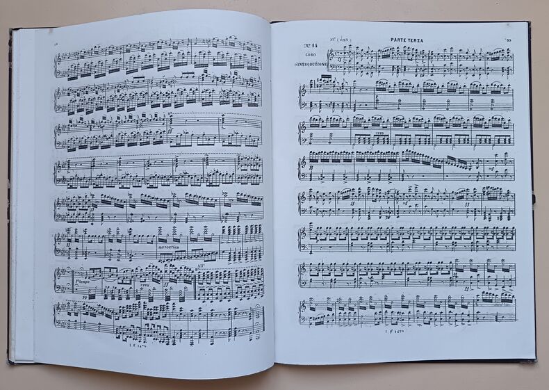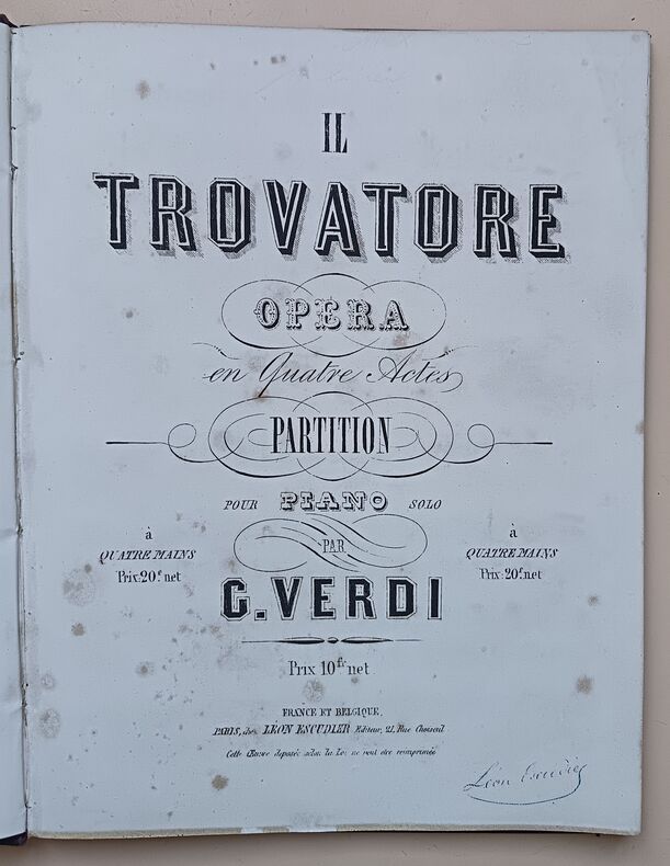 Ed. Léon Escudier, ref. L. E. 1479, non daté (ca1860), 61pp. In-folio. Bon état, reliure demi-toilée avec liserés et titrage dorés sur le dos, plats percaline (initiales dorée du propriétaire sur le plat supérieur, coiffes déformées, coins et rebords frottés : voir photos), intérieur frais (à signaler des rousseurs ne gênant pas la lecture, sinon partitions non annotées). Bon exemplaire bien relié.