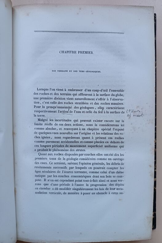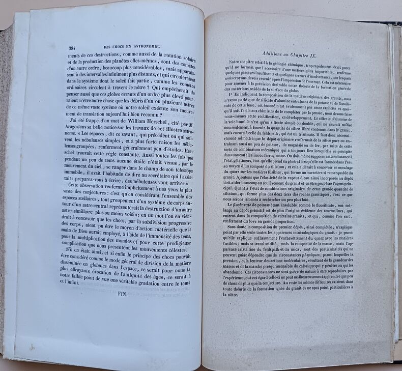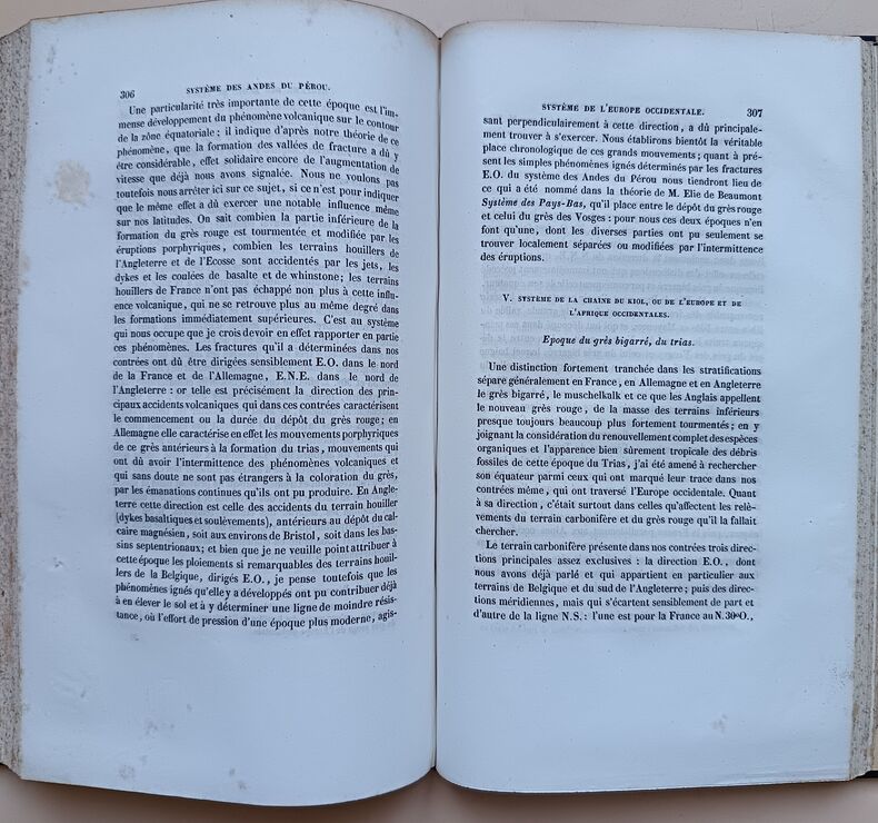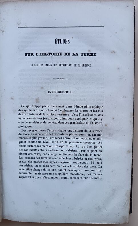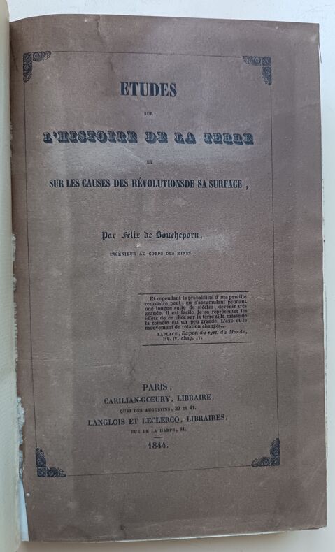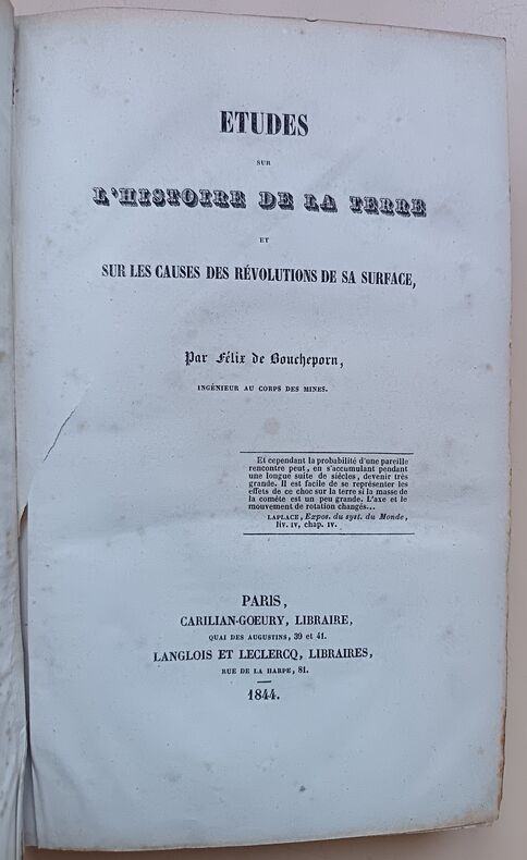 Paris, Carillian-Goeury, Laglois et Leclercq, Paris, Carillian-Goeury, Laglois et Leclercq1844 ; in-8, demi-veau fauve, dos lisse, filets dorés et à froid, pièce de titre noire, tranches jaspées. (Reliure de l’époque) 394 pp., iv pp. (additions), 3 ff. (table et errata), 2 planches dépliantes en noir et 1 grande planche dépl. en couleurs entoilée.ÉDITION ORIGINALE. Félix de Boucheporn (1811-1857) était ingénieur des mines. S’il a donné quelques publications proprement géologiques, ses deux principaux ouvrages relèvent surtout de la spéculation philosophique. Dans sont Etude sur l’histoire de la Terre, Boucheporn avance l’idée que la géologie et les formes vivantes sur la Terre ne peuvent s’expliquer comme l’aboutissement des phénomènes d’évolution observables aujourd’hui. Pionnier du transformisme catastrophiste, il considère que les évolutions graduelles des êtres et des roches telles qu’on les explique, existent bien durant des périodes de stabilité mais que la variété de milieux existants et passés ne peut s’expliquer qu’en considérant que ces ères sont séparées par des cataclysmes majeurs, la chute de comètes. 130 ans plus tard, Gould et Eldredge, en énonçant leur théorie des “equilibres ponctués” ne démentent pas Boucheporn.