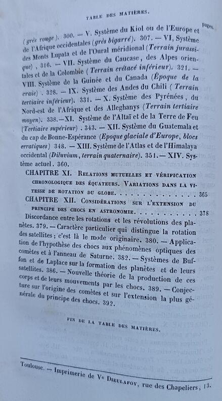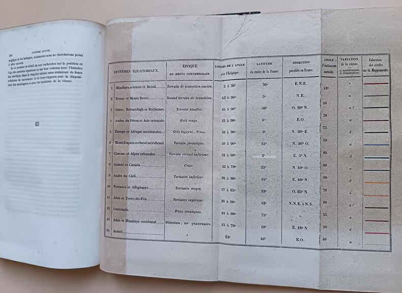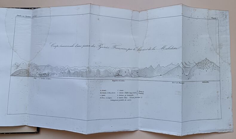 Etat très satisfaisant (découpe angulaire en page de titre, bon exemplaire par ailleurs) pour l'édition originale de ce rare ouvrage, orné de 3 planches dépliantes dont une belle carte en couleurs des "anciens équateurs", et une "Coupe transversale d'une portion des Pyrénées Françaises par le sommet de la Maladetta".
