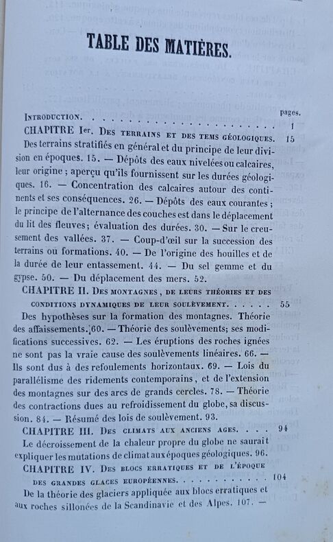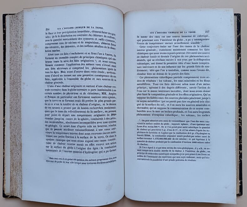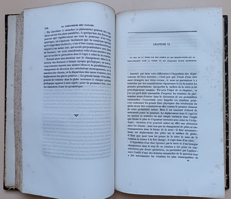 Première édition. Ce polytechnicien, ingénieur au corps des Mines examine les causes des révolutions (soudaines) qu'a subi la terre au cours de son histoire, notamment la possibilité de collisions avec des comètes. Un chapitre est consacré aux montagnes et particulièrement aux Pyrénées avec une grande planche dépliante montrant une coupe géologique qui passe par la Maladetta. Illustré par 1 tableau et 3 planches dépliantes, dont une mappemonde en couleurs. Ouvrage rare qui manque à Ward & Carrozi. Très bel exemplaire. /// In-8 de (2), 394, IV, (6) pp., 1 tableau, 3 planches dépliantes. Demi-maroquin vert, dos à nerfs, tranches marbrées. (Reliure de l'époque.) ////