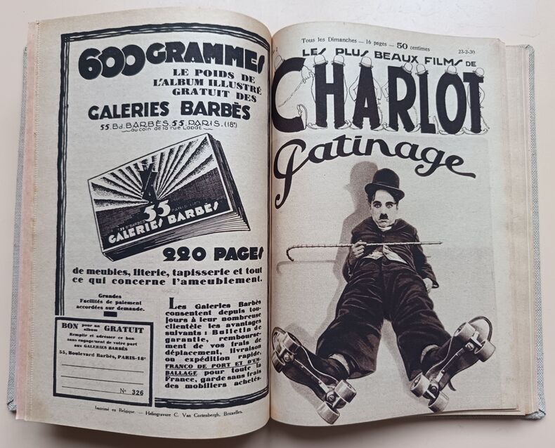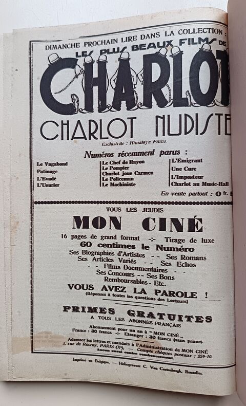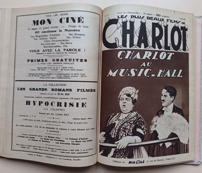 Ed. Editions de Mon Ciné, Impr. C. Van Cortenbergh, 1930, 14 fascicules de 16 pages, relié, In-4. Collection des 14 premiers fascicules de 15 pages chacun illustré des photos des films. 1. Le Vagabond. 2. Patinage. 3. L' évadé. 4. L'usurier. 5. Le chef de rayon. 6. Le pompier. 7. Charlot joue Carmen. 8. Le policeman. 9. Le machiniste. 10. L'émigrant. 11. Une cure. 12. L'imposteur. 13. Charlot au Music-Hall. 14. Trop de troubles. Très bon état, intérieur très propre et frais.