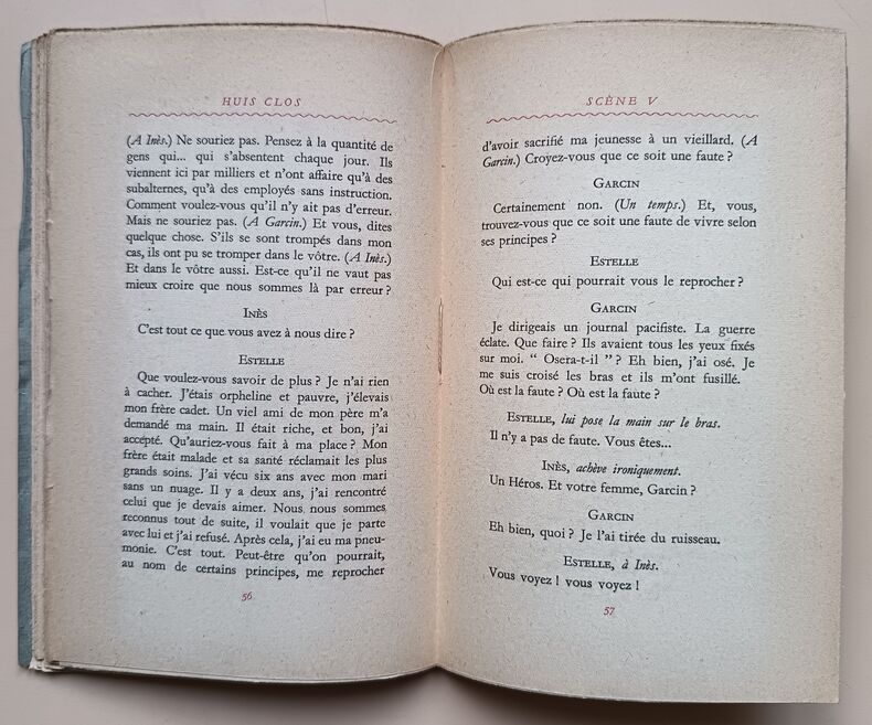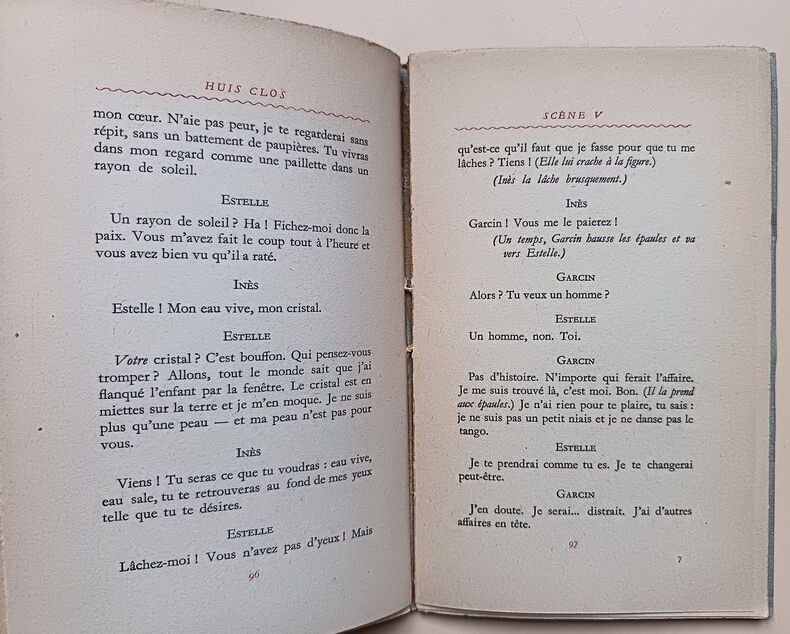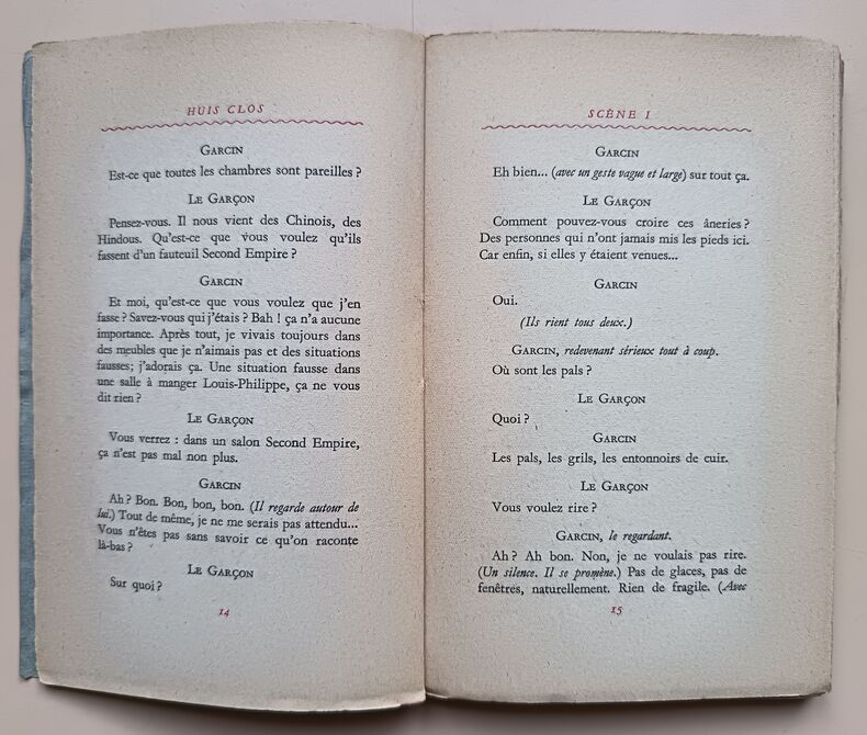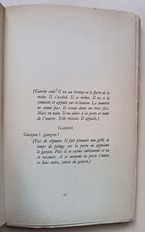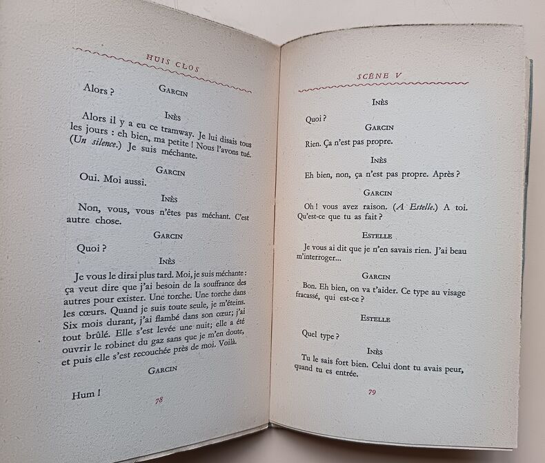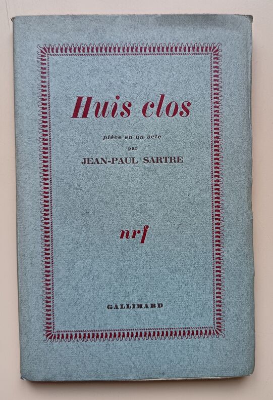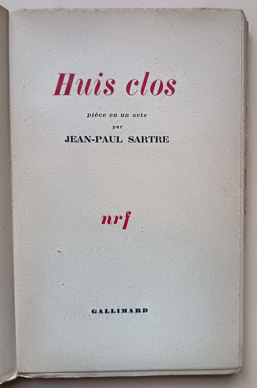 ÉDITION ORIGINALE de cette pièce de théâtre, symbolique de l'existentialisme athée, courant philosophique et littéraire représenté par Jean-Paul Sartre et Simone de Beauvoir. L'ouvrage est imprimé en rouge et noir. Tirage limité à 2274 exemplaires. UN des 250 EXEMPLAIRES hors-commerce numérotés sur papier de Châtaignier (« exemplaire H. C. 2040 »). Exemplaire en BON ÉTAT. GOOD COPY. PICTURES AND MORE DETAILS ON REQUEST.