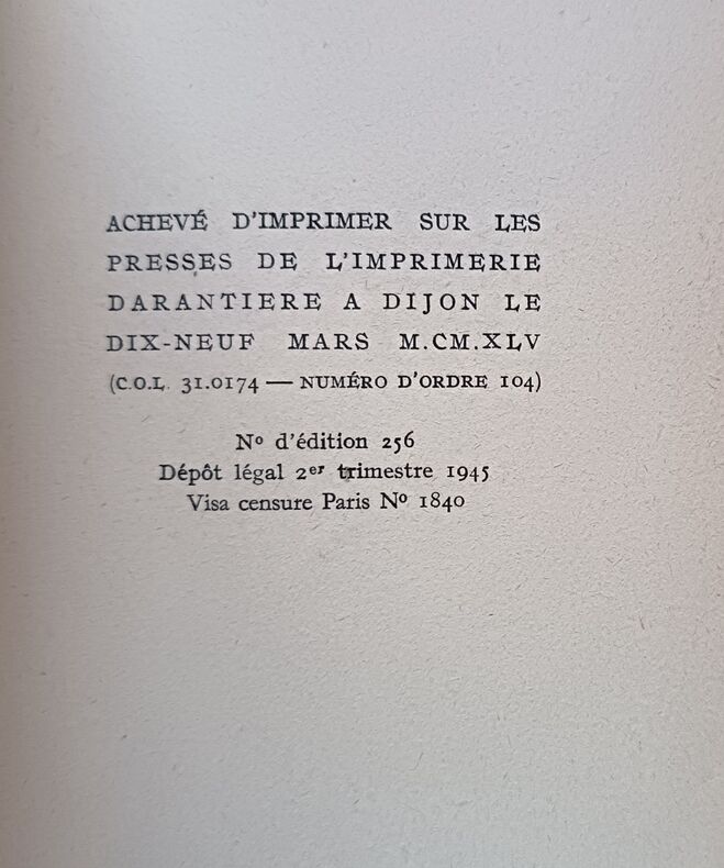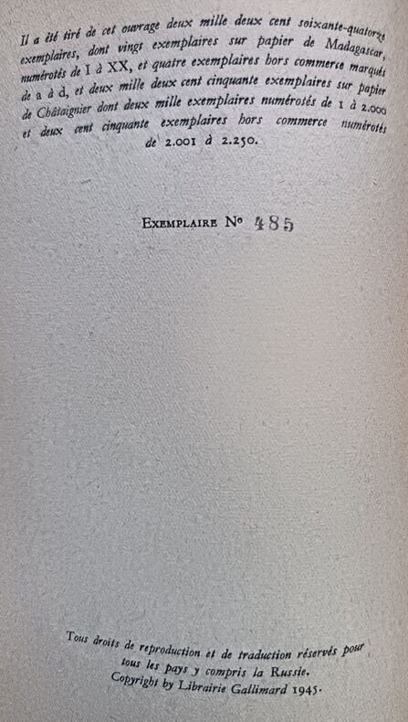 1946 Paris, Gallimard, 19 mars 1945. In-12 (188 X 123 mm) broché ; 123 pages, (2) ff. de table et achevé d'imprimer.