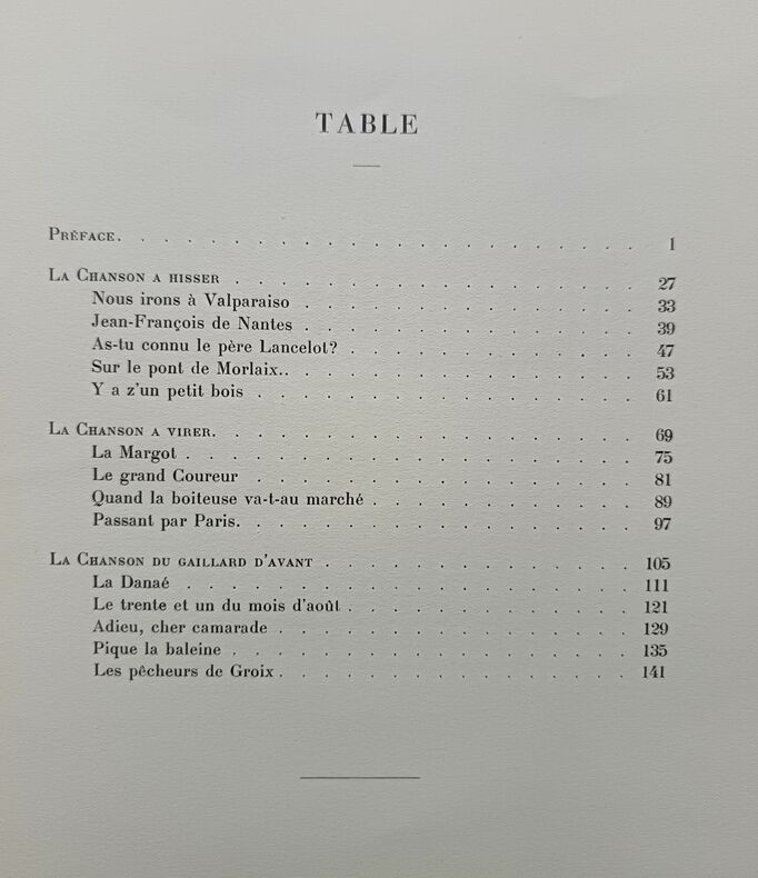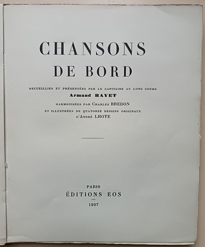 Chansons de bord recueillies et présentées par le capitaine au long cours Armand Hayet. Harmonisées par Charles Bredon et illustrées de quatorze dessins originaux d'André Lhote. (Paris: Editions Eos, 1927). [M.C.: chanson, marine]