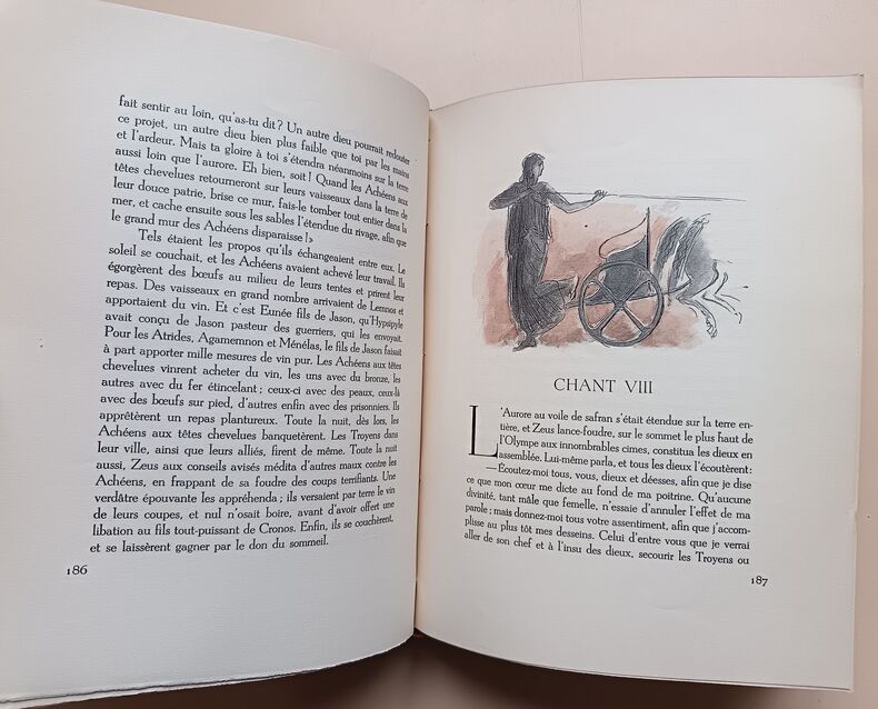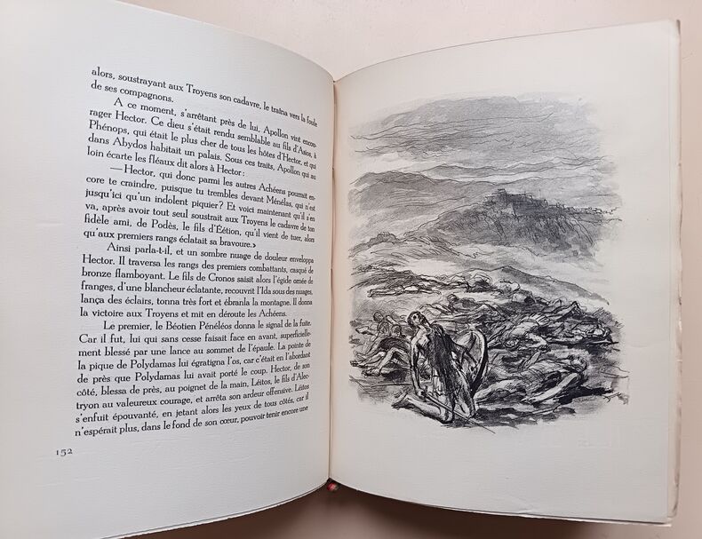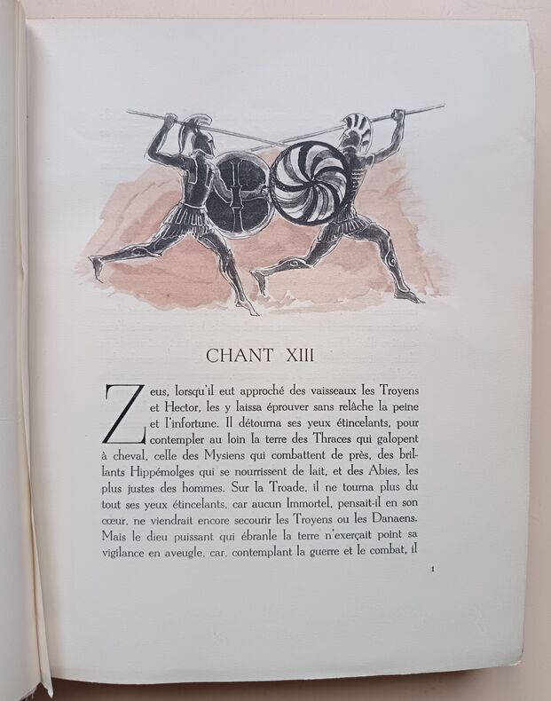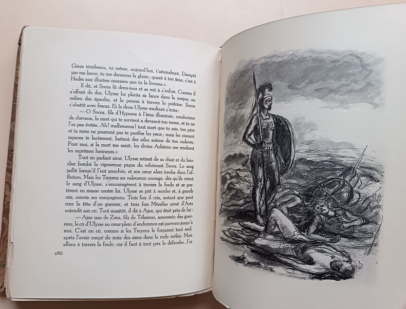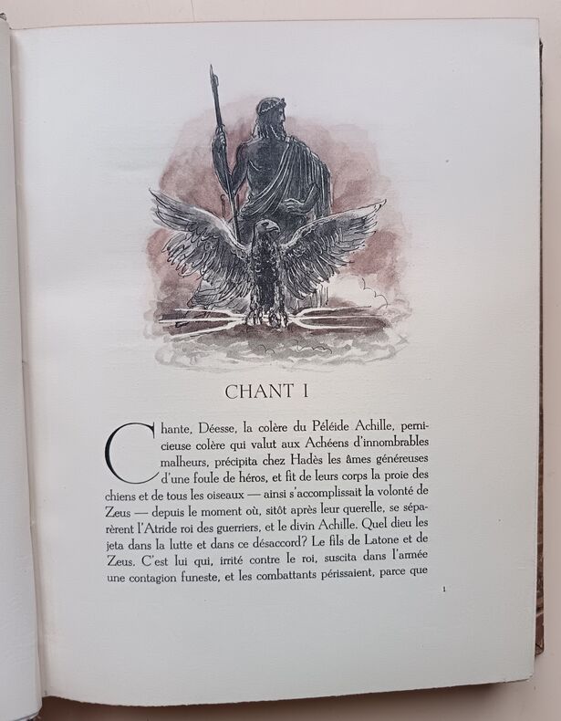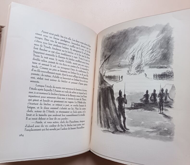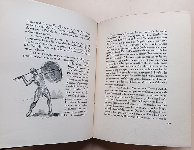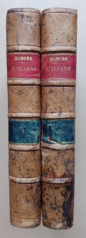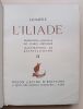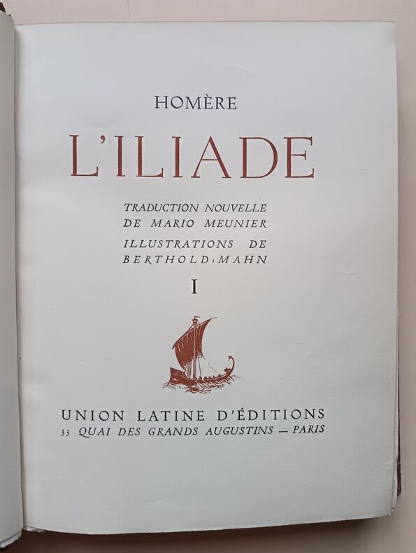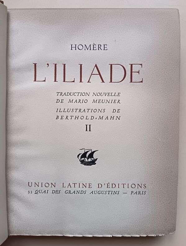 1943, Union latine d'éditions, in-4 brochés, couvertures rempliées, chemises cartonnés marbré, L'Iliade, 2 tomes, illustrations de Berthold Mahn, traduction nouvelle de Mario Meunier, exemplaire sur Pur Fil, Hors commerce | Etat : bon état général, sous chemises seulement, pas d'étui fourreau cartonné, ouvrages non coupés (Ref.: ref84925)