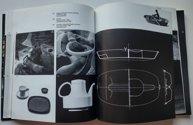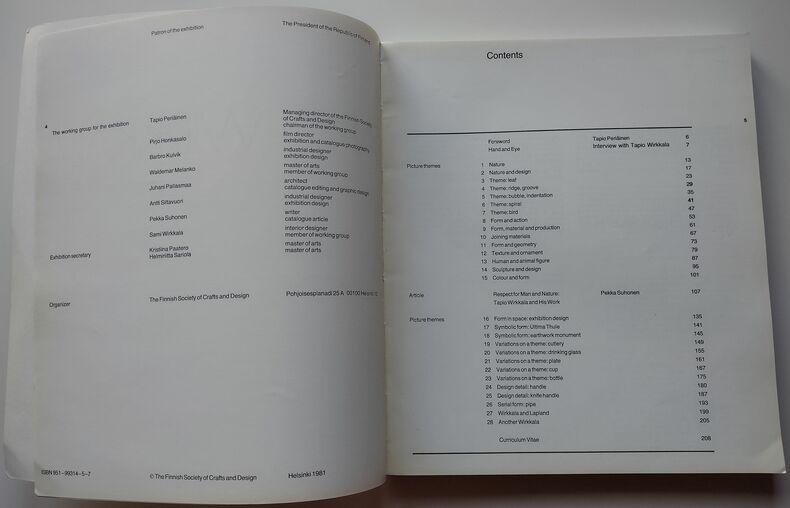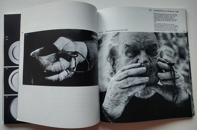 1981 Couverture souple Helsinki, The Finnish Society of Crafts and Design, 1981. Un volume petit in-4 (26 x 22,5 cm), broché, couverture grise de l'éditeur, motifs gaufrés sur les plats, quelques accrocs aux coupes, marque de pliure au dos. 210 pages, illustrées de nombreuses reproductions photographiques en noir et en couleurs. Texte en anglais et en finlandais. Le livre présente un panorama des créations de Wirkkala dans tous ses domaines : verrerie (pièces emblématiques pour Iittala (Ultima Thule, Kantarelli) et Venini (Murano)), céramique et porcelaine (objets et services pour Rosenthal), sculpture et Bois (ses œuvres modernistes en contreplaqué (feuilles sculptées)), design industriel (coutellerie, bouteille Finlandia Vodka, et ses travaux graphiques (billets de banque). Riche iconographie, ouvrage de référence sur la démarche artistique de Tapio Wirkkala et son influence sur le design scandinave. Très bon état intérieur, bon exemplaire.