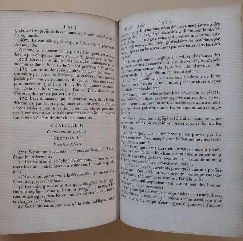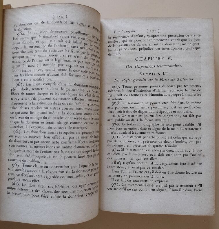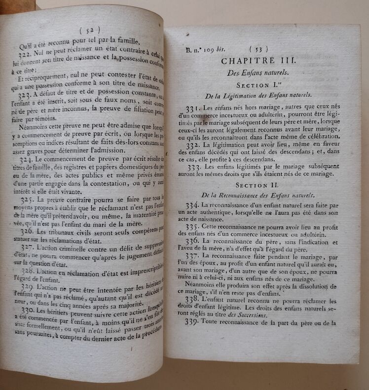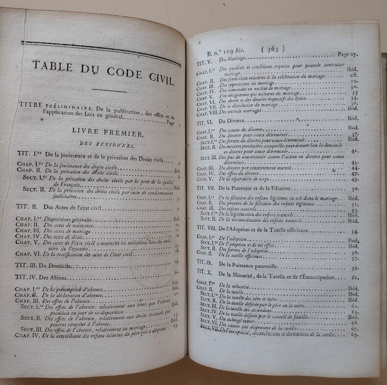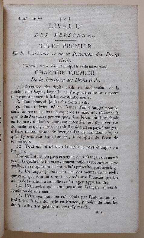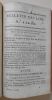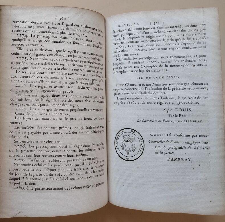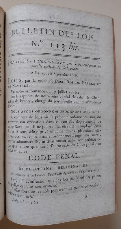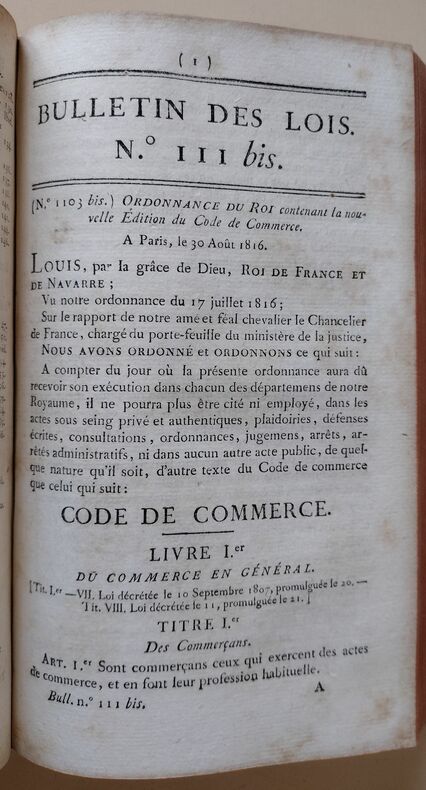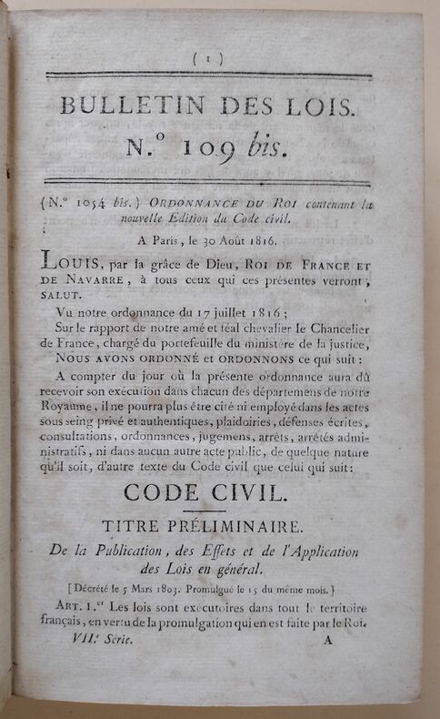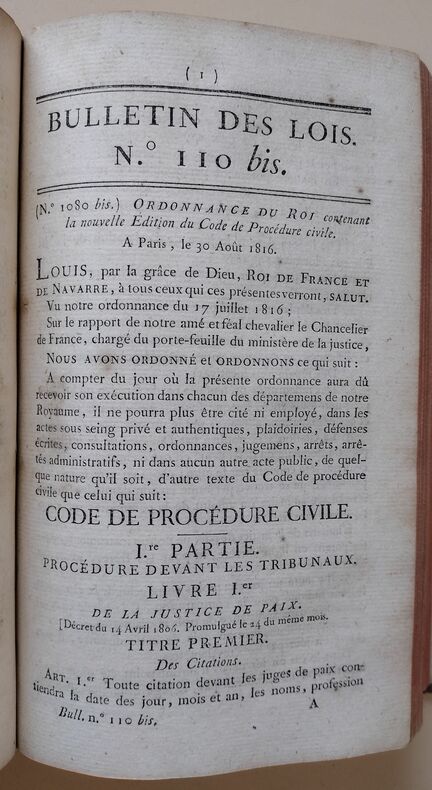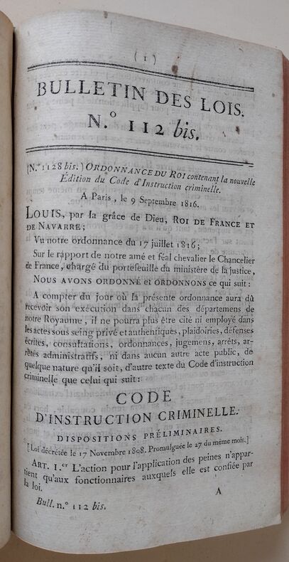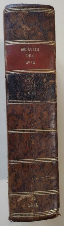 Ed. Imprimerie Royale, 1816, 371-176-114-124-103pp. In-8. Bon état, reliure demi-cuir avec plats cartonnés (dos avec étiquette de titrage, titrages et liserés dorés, coiffes arasées, mors fendus, épidermures & usures du dos et des plats, coins émoussés : voir photos), tranches colorées, intérieur très frais (quelques rousseurs concentrées sur les premières et dernières pages de chaque bulletin, sinon sans annotations ni phrases soulignées). Contient : ordonnance du Roi du 30 août 1816 contenant la nouvelle édition du Code civil. Bulletin des lois, No. 109 bis; 2 ordonnance du Roi du 30 août 1816 contenant la nouvelle édition du Code de procédure civile. Bulletin des lois, No. 110 bis; 3 ordonnance du Roi du 30 août 1816 contenant la nouvelle édition du Code de commerce. Bulletin des lois, No. 111 bis; 4 ordonnance du Roi du 9 septembre 1816 contenant la nouvelle édition du Code d'instruction criminelle. Bulletin des lois, No. 112 bis; 5 ordonnance du Roi du 9 septembre 1816 contenant la nouvelle édition du Code pénal. Bulletin des lois, No. 113 bis. Nouvelle édition publiée juste après la Restauration avec les modifications (comme l’interdiction du divorce loi "Bonald"). Rare exemplaire bien conservé.