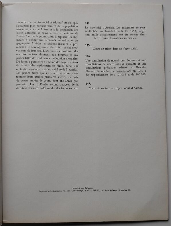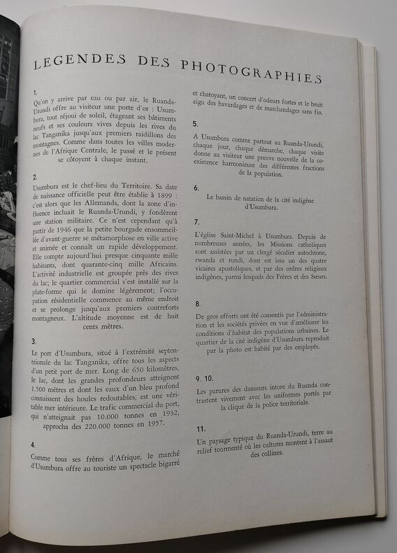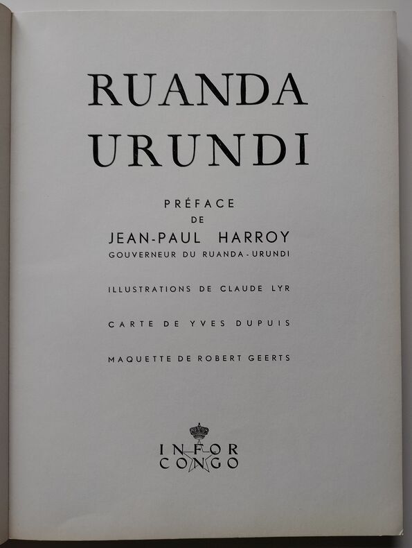 Ed. Infor Congo, 1958, 147pp + « Légendes des photographies » non paginées, In-4. Bon état. Couverture rigide sous sa jaquette illustrée éditeur. (Jaquette déchirée sur le dos supérieur, manque sur le dos inférieur, frottée sur les bords). Intérieur très frais. Sans annotations ni phrases/illustrations soulignées. Voir photos. Préface de Jean-Paul Haroy (Gouverneur du Ruanda-Urundi), illustrations de Claude Lyr, carte de Yves Dupuis, maquette de Robert Geerts.. Très rare exemplaire.