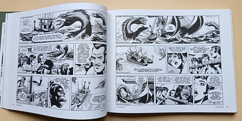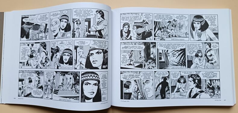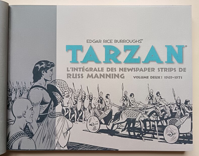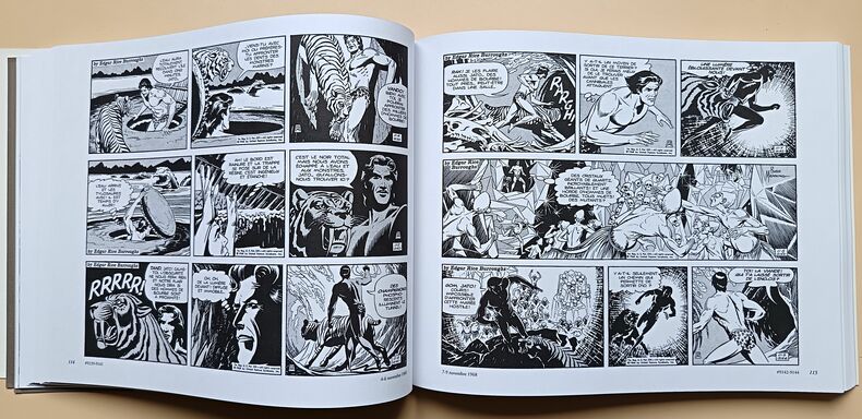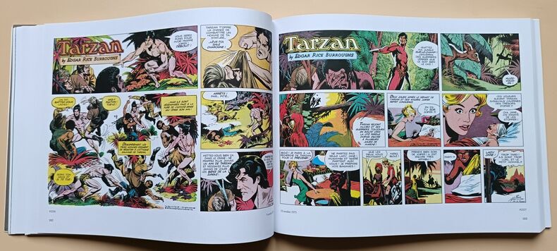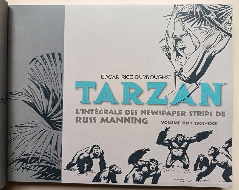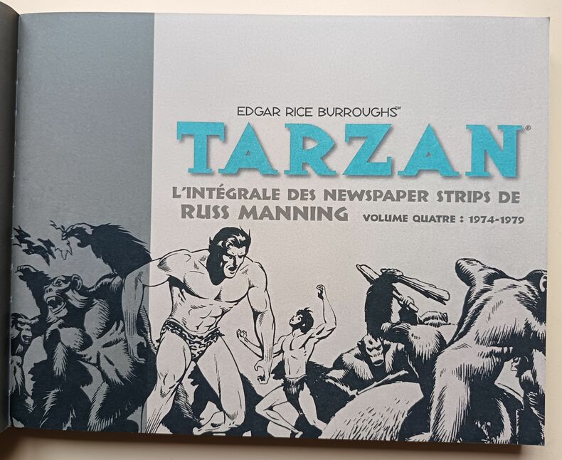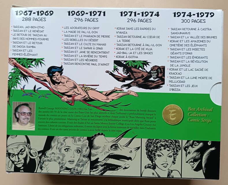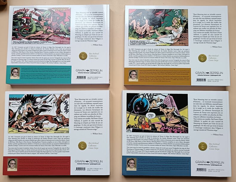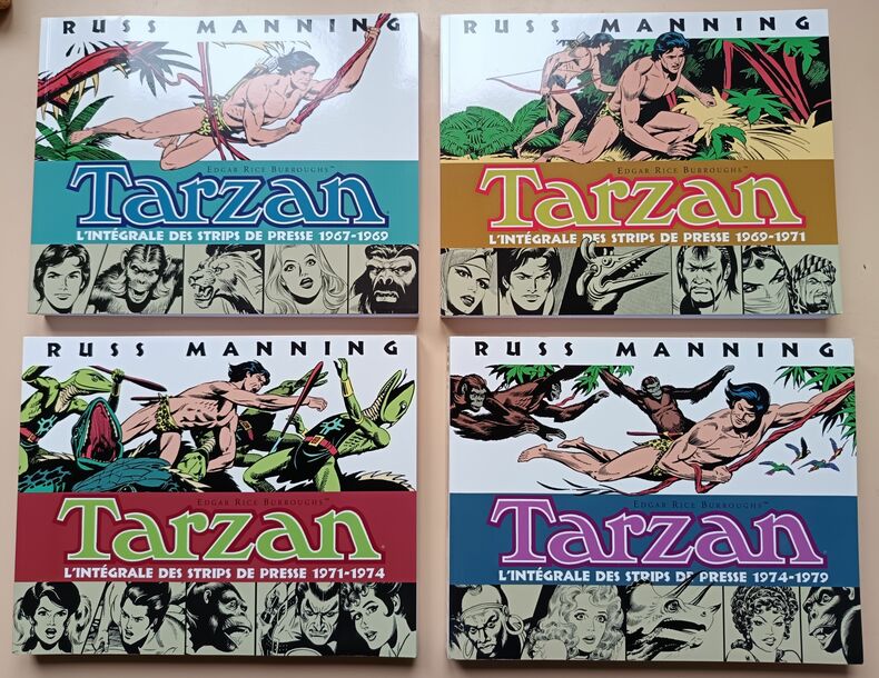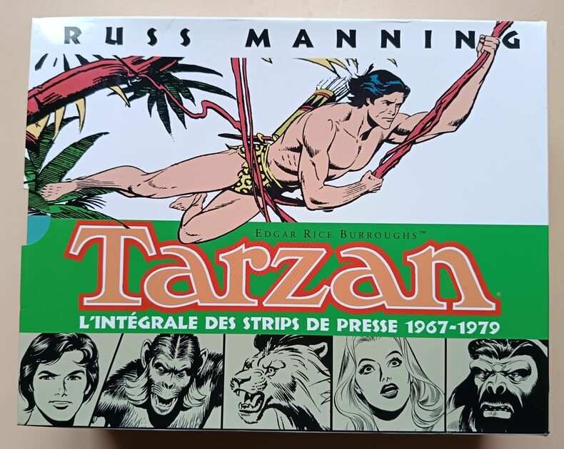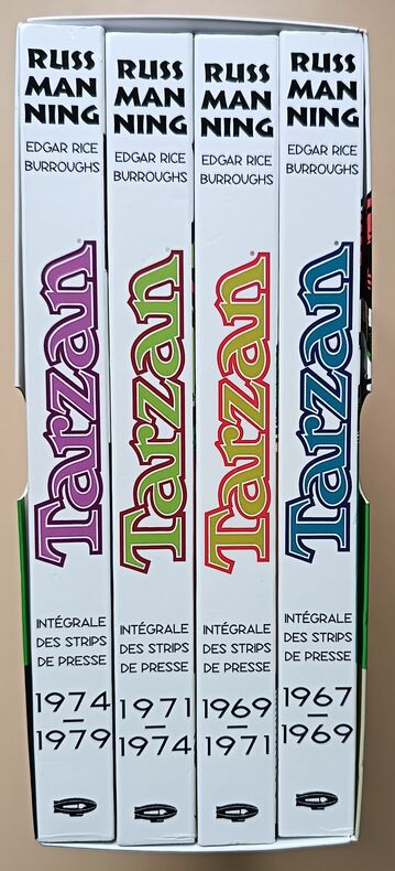 Ed. Graph Zeppelin, 2021, 1180pp. en tout, in-4 (format à l'italienne). 4 volumes brochés de la collection enchâssés dans un étui cartonné. Mention de seconde édition. Excellent état, étui cartonné illustré éditeur propre, couvertures souples illustrées éditeur propre, intérieurs très propres (sans annotations ni phrases/illustrations soulignées). Ensemble en excellent état. "Russ Manning qui s’est illustré en produisant les adaptations en BD des romans d’Edgar Rice Burroughs se voit confier la création des pages de Tarzan qui paraissent chaque jour dans la presse depuis le 7 janvier 1929, avec comme condition que celles-ci soient en harmonie avec la vision du créateur. Assisté de Bill Stout, Mike Royer et Dave Stevens, qui deviendront des dessinateurs réputés, Manning illustre 9 histoires complètes en noir et blanc et 22 histoires en couleurs. L’action couvre l’ensemble des mondes créés par Burroughs : Afrique équatoriale et saharienne pleine de mystère, mais aussi les mondes perdus de Pal-ul-don aux animaux préhistoriques, Opar la cité atlante oubliée dirigée par la séduisante reine Lâ, Pellucidar le monde au creux de la Terre, Xuja la cité des fous, des mondes pharaoniques surgit du passé… Avec son dessin élégant et dynamique, expressif et précis, Russ Manning a su produire les plus grandes adaptations de Tarzan en bande dessinée. Tout ce matériel a été tiré du fonds de la Edgar Rice Burroughs Inc et est d’une qualité irréprochable consacrée par le Eisner Award. Ce produit comprend les 4 volumes brochés de la collection enchâssés dans un étui cartonné. Un bel ensemble patrimonial de près de 1200 pages à un prix abordable. Tirage limité à 1000 ex !" (notice de l'éditeur).