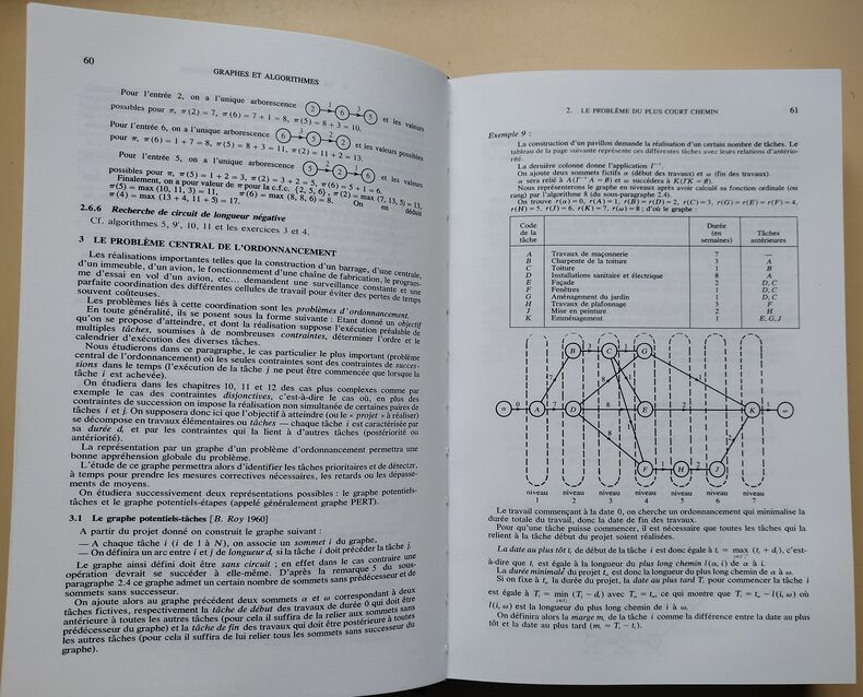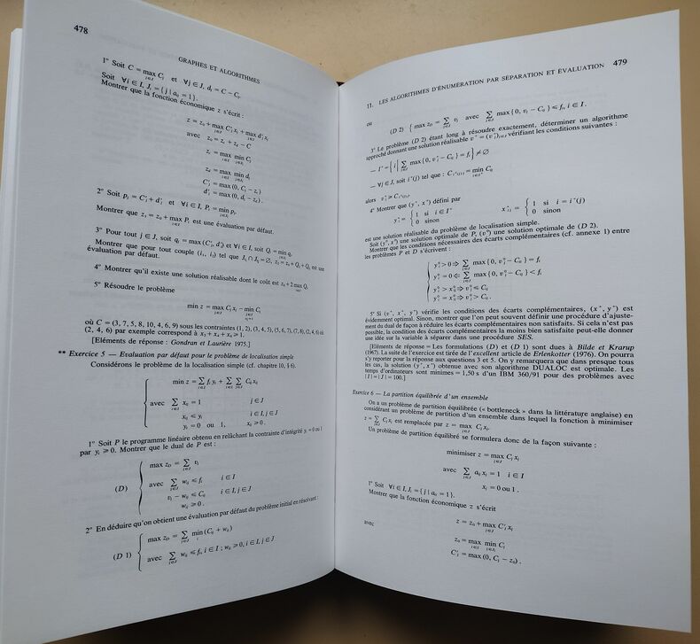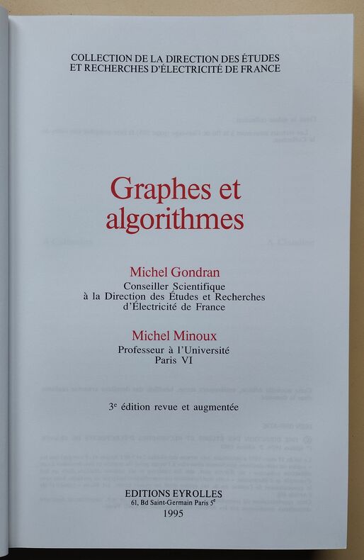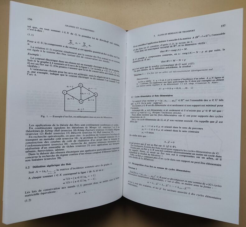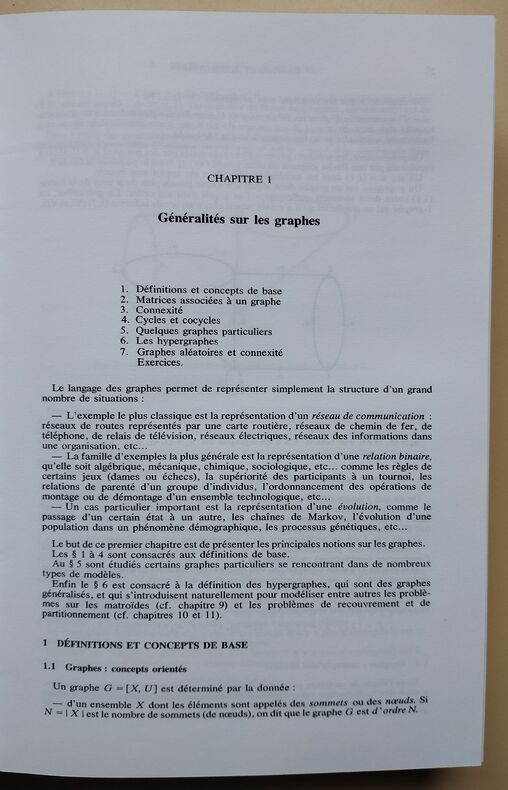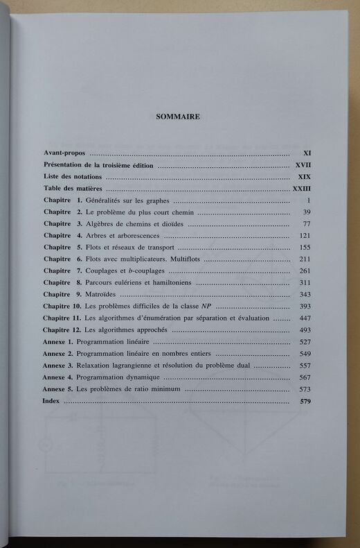 nombreuses figures dans le texte en noir et blanc, notamment des graphes nouvelle édition, 2002 Contents, Chapitres : Préface, Table, Avant-propos, xxv, texte, 299 pages - Graphes non valués et formulations de problèmes - Algèbre de Boole appliquée - Programmation dynamique - Chemins optimaux - Introduction aux ordonnancements - Arbres et tournées - Flots maximaux - Flots maximaux de cout minimal - Programmes de transport et affectations couverture à peine jaunie avec une tres legere trace de pliure au coin supérieur, sinon bon état, intérieur frais et propre - tome 1 seul, complet en lui-même (le tome 2 (absent) concerne les phénomènes aléatoires, le tome 3 (absent), la programmation linéaire)