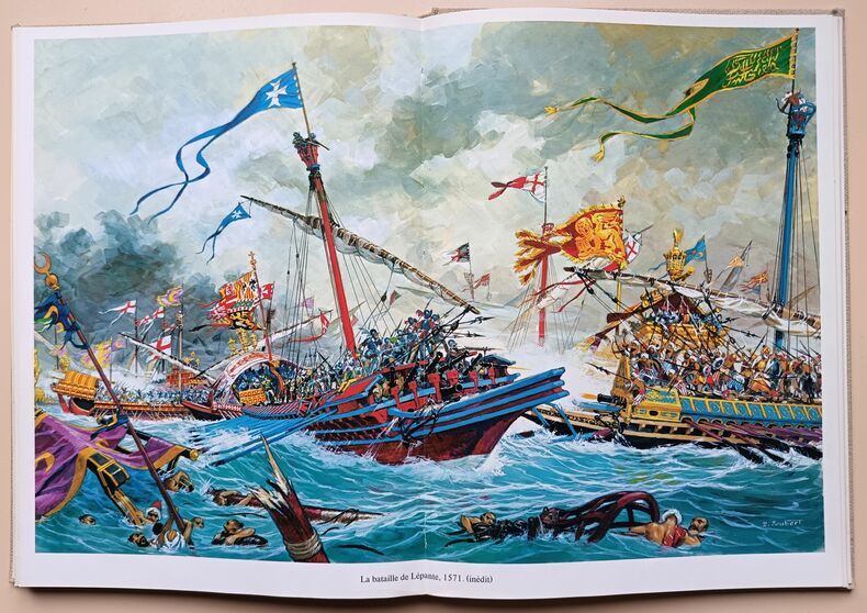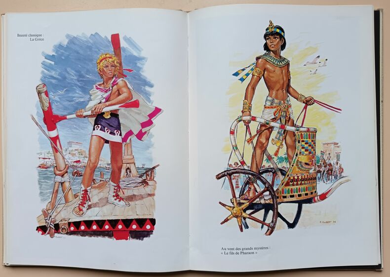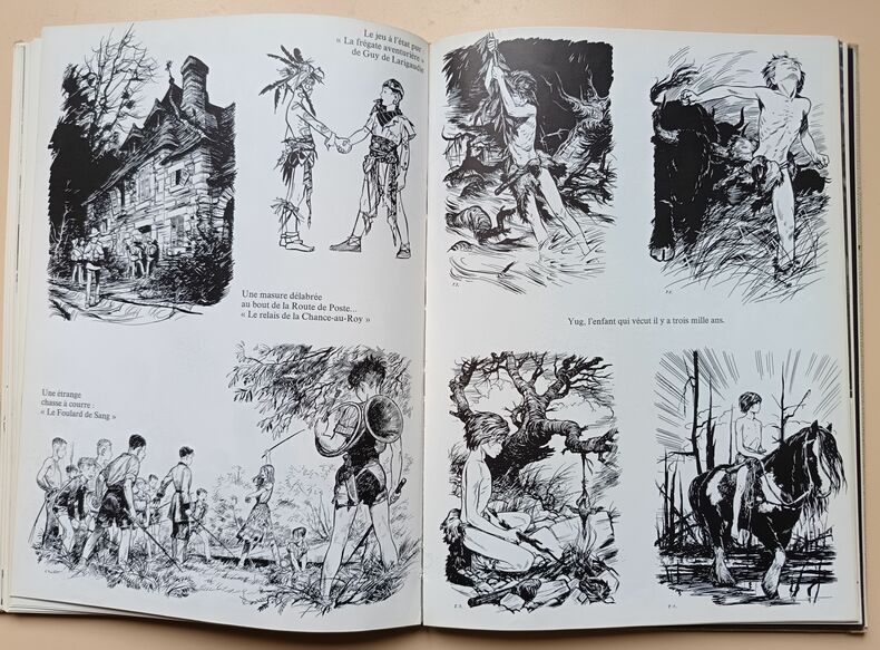 Epi 1979, in-4 (31 x 22,5 cm) relié pleine toile grège de l'éditeur sous belle jaquette illustrée, non paginé, environ 120 p. (très bon exemplaire) Edition originale tirée à 700 exemplaires, 1 des 50 exemplaires numérotés hors-commerce comportant une suite de 16 pages de dessins en couleurs tirés de l'album. Très beau recueil , bien représentatif de son talent, que ce soit dans des romans scouts ou des albums historiques divers ; à noter, une superbe reproduction double page en couleurs de la bataille de Lépante.