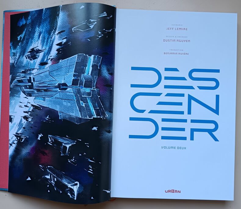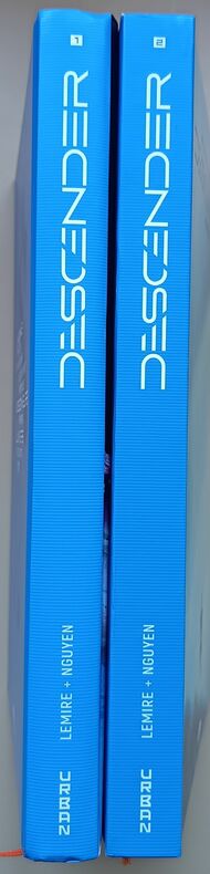 Ed. Urban, collection " Grand Format Urban", 2022 (mars 2022 volume 1 - octobre 2022 volume 2), non paginés (376pp et 400pp sur le site éditeur), In-folio. Premières éditions. Très bon état, couvertures cartonnées illustrées éditeur propres, intérieurs très propres (sans annotations ni phrases/illustrations soulignées). Volume 1 contient : Descender Tomes 1 à 3 parus dans la collection Urban Indies, volume 2 contient : Descender Tomes 4 à 6 parus dans la collection Urban Indies. Bel ensemble complet de cette première édition.