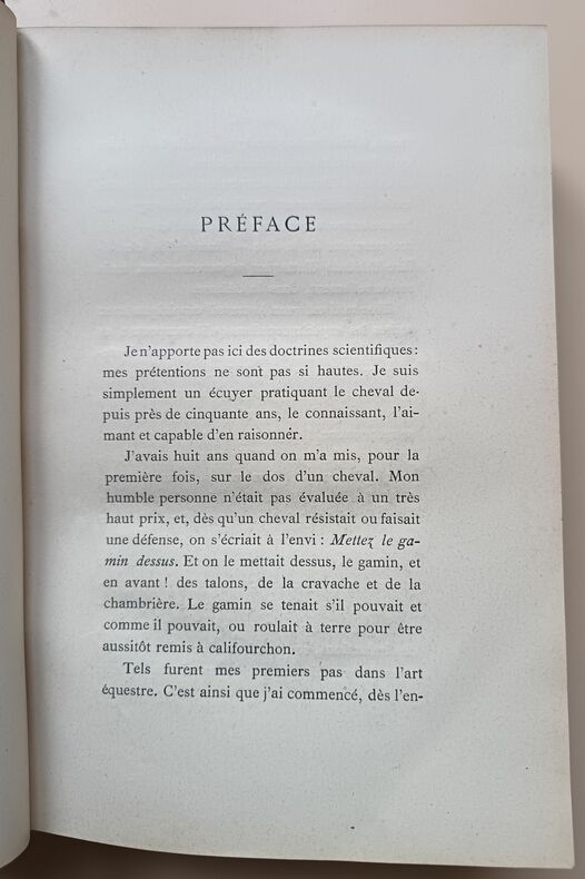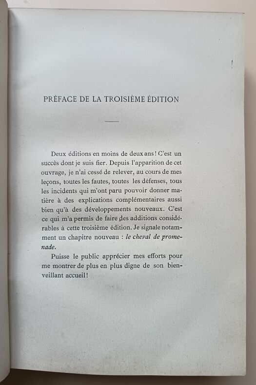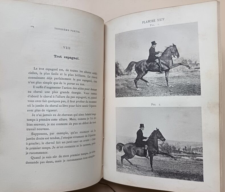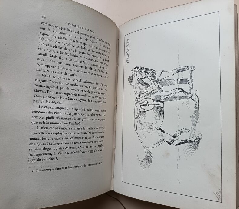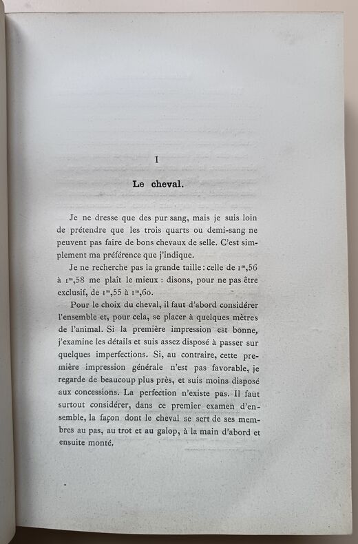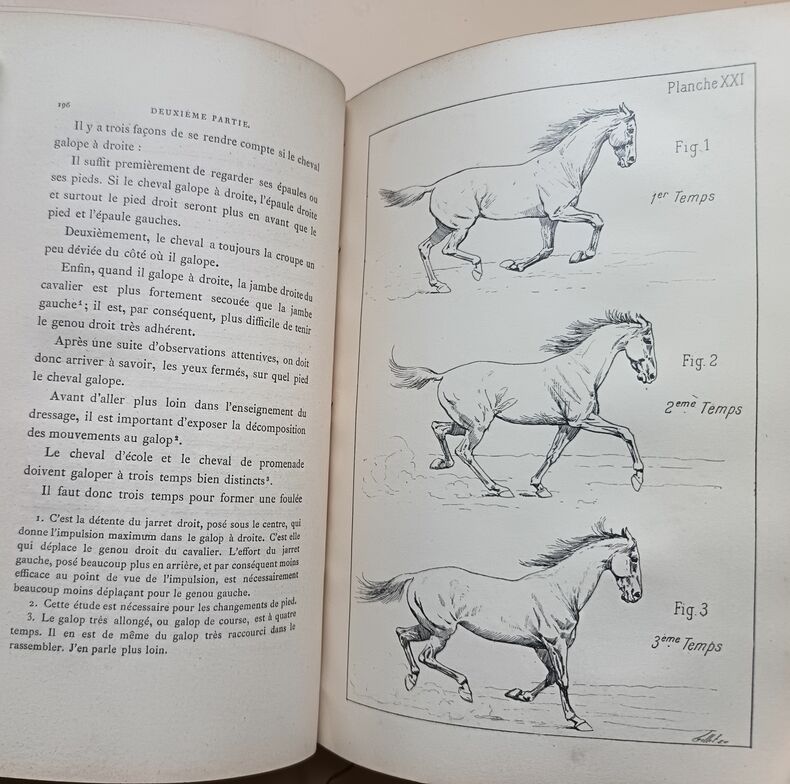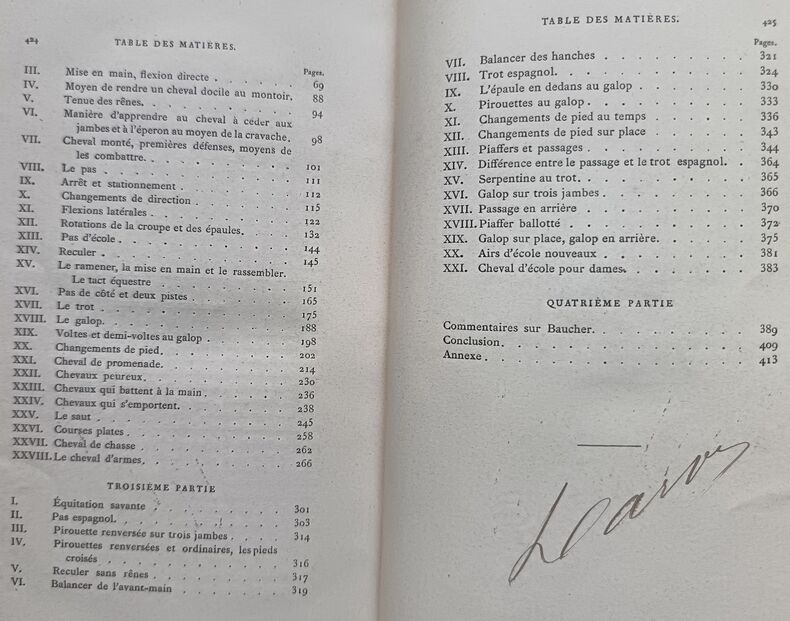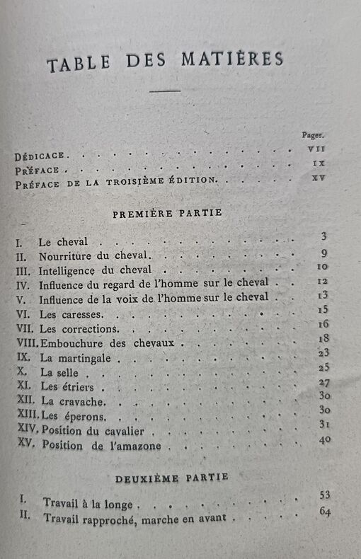 *I, le cheval (nourriture, intelligence, caresses, selle, position du cavalier ou de l'amazone...) *II, le dressage (longe, tenue des rênes, saut, dressage pour la course, la chasse, l'armée...) *III équitation savante (pas espagnol, piaffers, cheval d'école pour Dames...) *IV, commentaires sur Boucher.