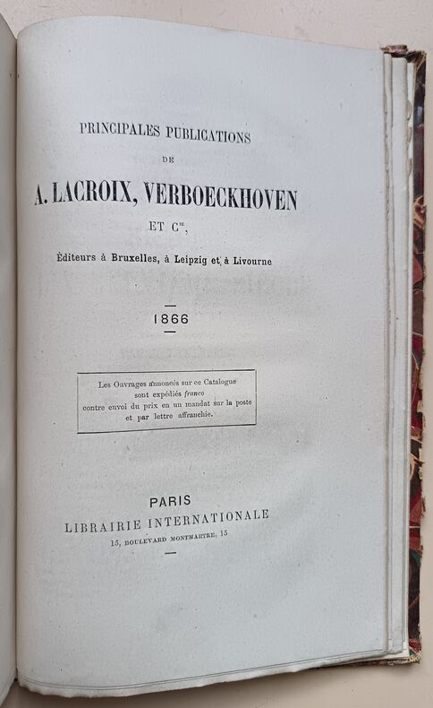 Ed. Lacroix, A., Verboeckhoven, Librairie internationale, 1866, 328-327-279pp (Catalogue de la librairie en fin du tome troisième), in-8. Bon état. Reliures aux plats marbrés. (Traces d’usure, bords frottés, coins émoussés). Intérieurs très frais, exempts de rousseurs. (Couvertures d’origine conservées). Anciens livres de bibliothèque, tampon en page de titre et friche d’emprunt en fin d’ouvrage, sinon, Sans annotations ni phrases/illustrations soulignées. Voir photos. Mention Quatrième édition.