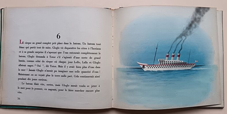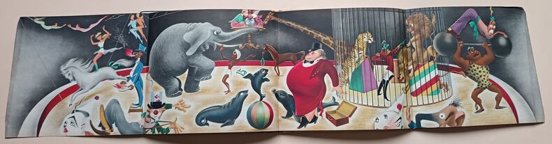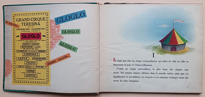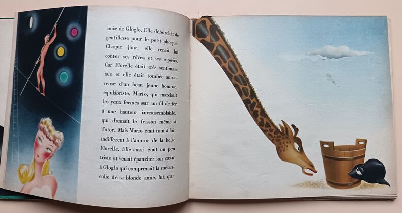 Paris, Prisma, 1948, In-8 oblong ( 220 X 250 mm), couvertures cartonnées illustrées, le second « o » découpé pour laisser apparaître la tête de Gloglo, lettrage du titre, dos toilé blanc, 94 pp. dont faux-titre avec une dédicace imprimée de l’auteur & titre, illustrations in-t. dont une magnifique illustration centrale dépliante. Très bel état, exempt de rousseur. Très beau livre sur l’univers du cirque, très belles illustrations.