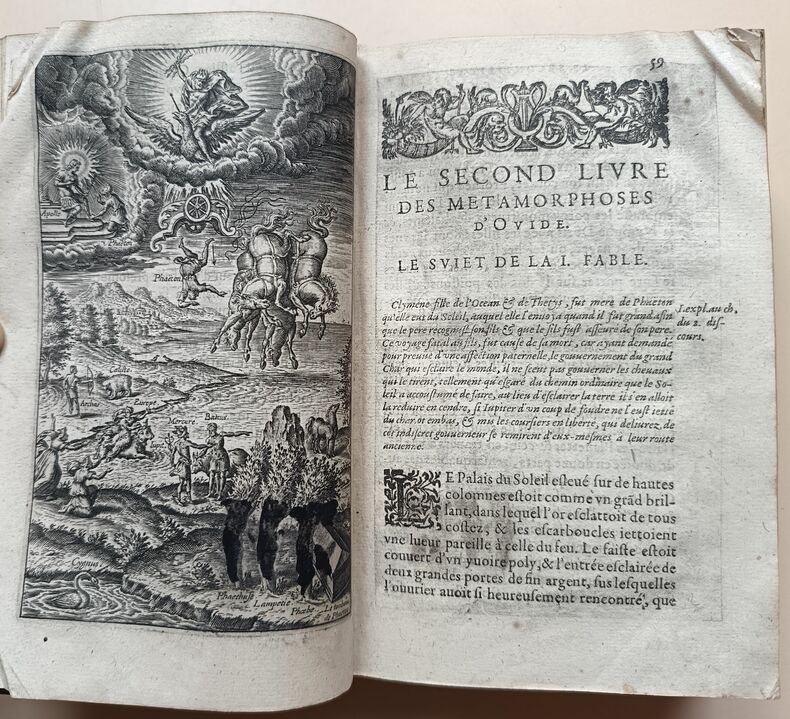 Ed. absence de page de titre pour les Métamorphoses (1614 chez la Veuve Guillemot ?), Chez la veuve Guillemot, & S. Thiboust 1614 (Jugement de Paris), Chez Matthieu Guillemot 1612 (XV discours), 801-48-300pp. Notre exemplaire ne comprend pas de page de titre et s'ouvre sur la fin d'un texte de Renouard suivi de "L'élégie pour Ovide" de Delingendes, suivie d'un hommage de Motin "A Monsieur Renouard sur la traduction des Métamorphoses d'Ovide" et des "Stances sur les métamorphoses d'Ovide traduites par Monsieur Renouard" signées D. DM. (voir photos). Chaque livre des Métamorphoses ainsi que la page de titre du Jugement de Paris, est orné d'un frontispice signé Léonard Gaultier. État très correct, reliure pleine peau avec dos orné et titré (épidermures, mors fendus, coiffes arasées, coins émoussés : voir photos), rebords frottés avec un liseré doré, tranches salies, intérieur frais (à signaler que les Discours ne sont pas complets : notre exemplaire s'arrête au milieu du XIV et le XV est absent : voir photos), nombreuses annotations, ex-libris et même dessins sur les pages de titre, de fin et tables (de plusieurs auteurs et époques : voir photos), pages 20 à 90 cornées, l'illustration de la page de titre du Jugement présente une brulure (tabac ?), légères rousseurs ne gênant aucunement la lecture. Rare exemplaire, comprenant 3 ouvrages solidement reliés en un, de cette traduction de Renouard, avec les belles illustrations gravées par Gautier.