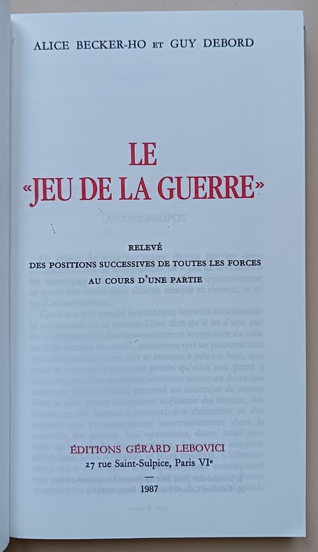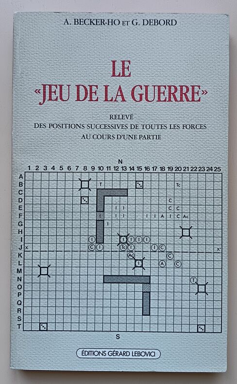 Ed. Editions Gérard Lebovici, 1987, 160pp. In-8. Très bon état, couverture souple illustrée à rabats éditeur propre (dos légèrement insolé), intérieur très propre (sans annotations ni phrases/illustrations soulignées : voir photos). Rare première édition du célèbre ouvrage de Debord et Becker-Ho présentant les positions du jeu inventé par Debord.