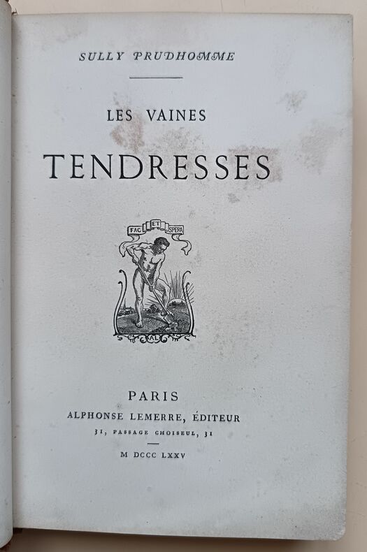 Paris Librairie Alphonse Lemerre, sans date (vers 1920) 0 in 12 (16x10) 1 volume reliure demi maroquin havane à coins de l'époque, dos à à nerfs orné, tête dorée, couverture conservée, 268 pages. Oeuvres de Sully Prudhomme: Poésies 1872-1878, Les vaines tendresses, La France, La révolte des fleurs, Poésies diverses, Les destins, Le zenith. René Armand François Prudhomme, dit Sully Prudhomme, 1839-1907, poète français. Bel exemplaire ( Photographies sur demande / We can send pictures of this book on simple request )