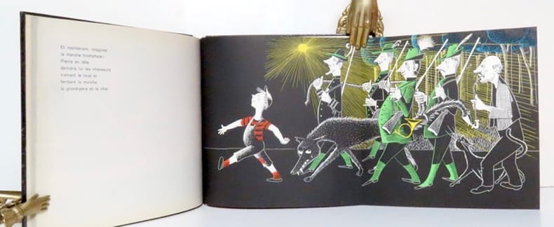 "Pierre et son grand-père habitent une petite maison à l'orée des bois, entourés d'un oiseau, d'un chat et d'un canard. Mais au-delà de la prairie, dans la forêt voisine, un danger menace : le loup. Et lorsque ce dernier surgit, affamé, l'audace et le courage de Pierre pourront faire leurs preuves... Une nouvelle illustration du célèbre conte écrit et mis en musique en 1936 par le compositeur russe Sergueï Prokofiev. " Une bien jolie adaptation !