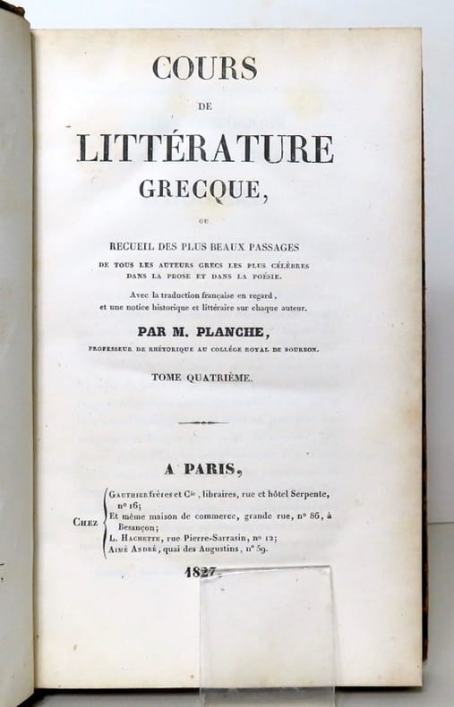 A Paris et à Besançon, chez Gauthier / Hachette / Aimé André, 1827. In-8, plein maroquin, dos lisse avec titre et décors dorés, roulette et filet doré encadrant les plats, tranches marbrées. Reliure hélas très frottée (voir image), quelques rousseurs. Etiquette de prix scolaire (1843) au premier contreplat.