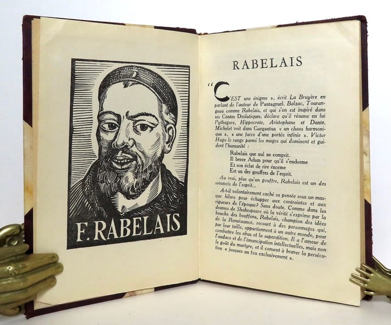 Editions KRA, 1931 ; Ouvrage illustré par Dubout avec une mise en couleur original signée pour indication coloriel ! "Illustration d'une grande originalité", Carteret IV. Ouvrage très bien relié.N° 728/1000. Reliure signée. Deuxième roman de François Rabelais. Il conte les années d’apprentissage et les exploits guerriers du géant Gargantua. Plaidoyer pour une culture humaniste contre les lourdeurs d’un enseignement sorbonnard figé, Gargantua est aussi un roman plein de verve, d’une grande richesse lexicale et d’une écriture souvent crue, volontiers scatologique. Immédiatement, le nouveau-né mort de soif réclame « à boyre ». Surpris et amusé par une telle soif, Grandgousier, son père, s’exclame : « Que grand (gosier) tu as », ce qui vaudra à l’enfant d’être appelé Gargantua.