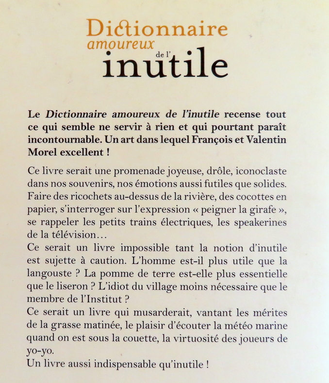 Le Dictionnaire amoureux de l'Inutile se propose de recenser tout ce qui semble ne servir à rien et qui pourtant paraît indispensable.