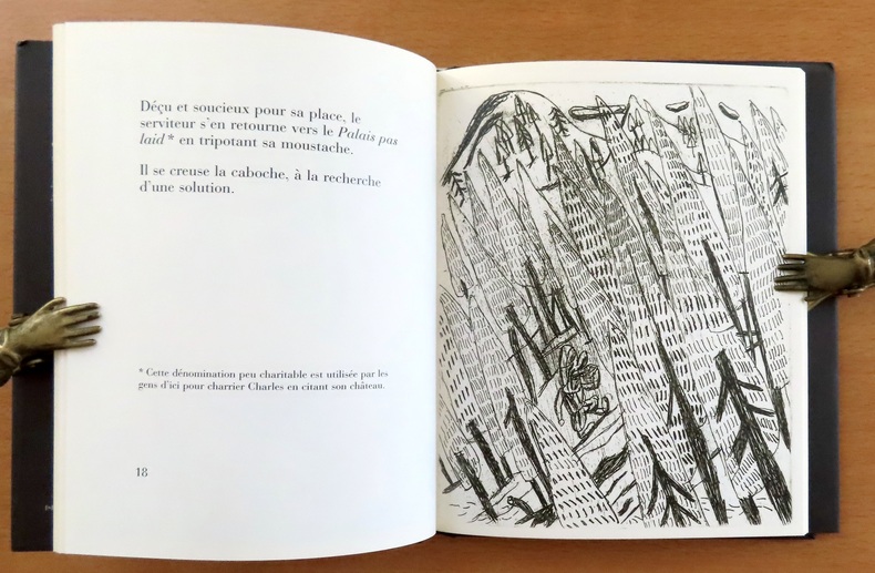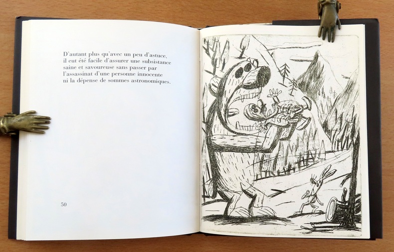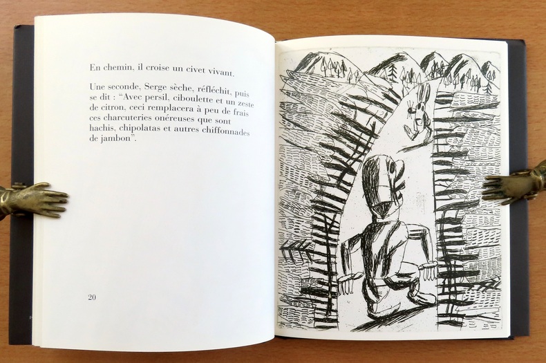 Montigny-sur-Loing, Benoït Jacques, 2004, 16 X 19 cm., relié, 63 pages. "Sorte de satire sociale assortie de sa suite d'estampes ciselées en taille-douce". Illustration hors texte en noir sur chaque page impaire. Dessin original signé de l'auteur en dédicace sur toute la page de faux titre. Percaline noire imprimée sous jaquette illustrée. Le tout en bel état.