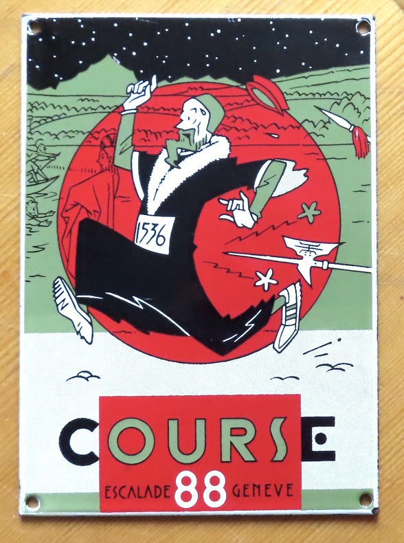 Genève, Course de l'Escalade, 1988. Plaque émaillée au format 12 x 17 cm., illustrée par Exem. Trous circulaires aux coins, pour la mettre au mur (en attendant d'être sur le vôtre, elle est sur le nôtre).