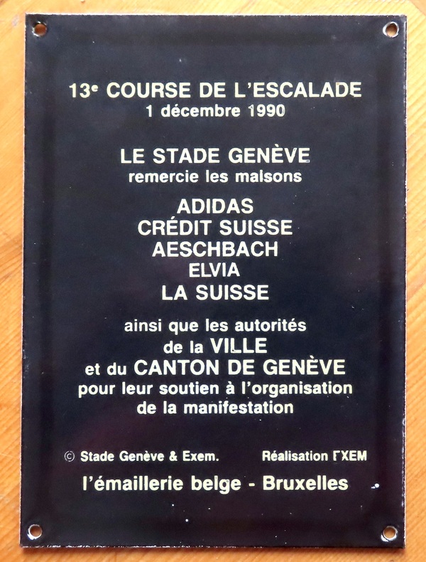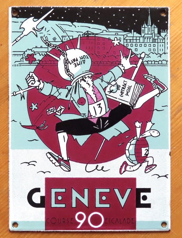 Genève, Course de l'Escalade, 1990. Plaque émaillée au format 12 x 17 cm., illustrée par Exem. Trous circulaires aux coins, pour la mettre au mur (en attendant d'être sur le vôtre, elle est sur le nôtre).