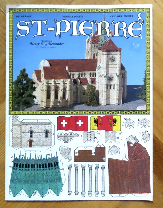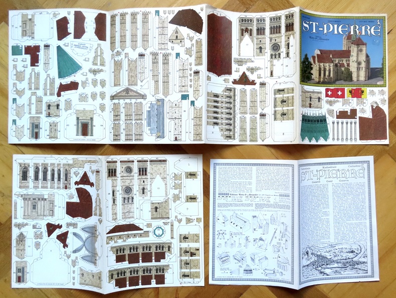 Ketty & Alexandre, 1982. 6 planches cartonnées. Chaque planche comporte des éléments en couleurs de la Cathédrale, à détacher et assembler. Plan de montage sur un double feuillet qui comporte aussi le texte de Jean-Etienne Jenequand, en français-allemand-anglais. Menus défauts, mais rien qui n'atteigne les pièces à monter.