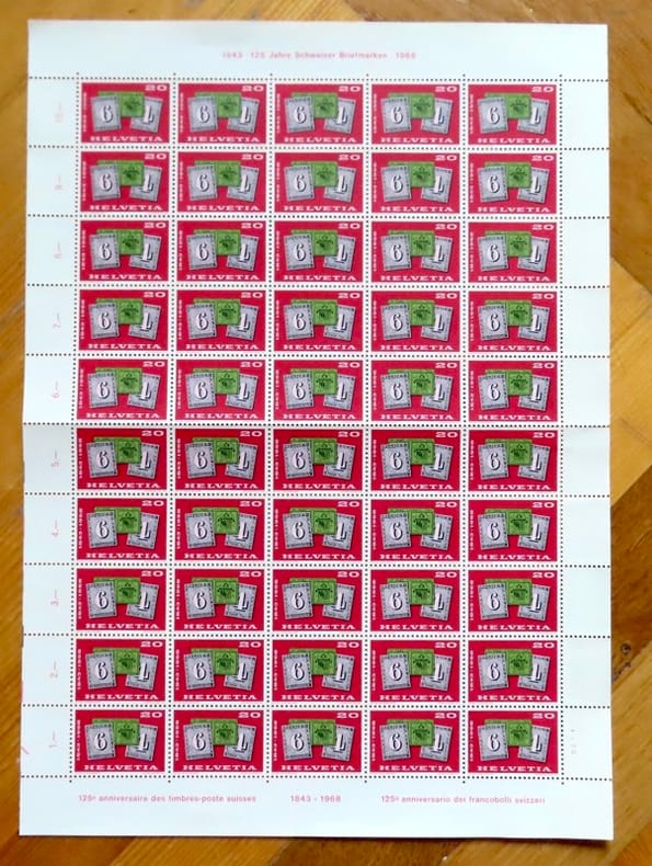 PTT, 1968. Feuille de 50 timbres (poste suisse), valeur faciale totale 10 francs, à l'état de neuf, non oblitérés.
