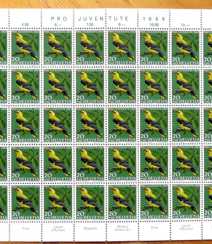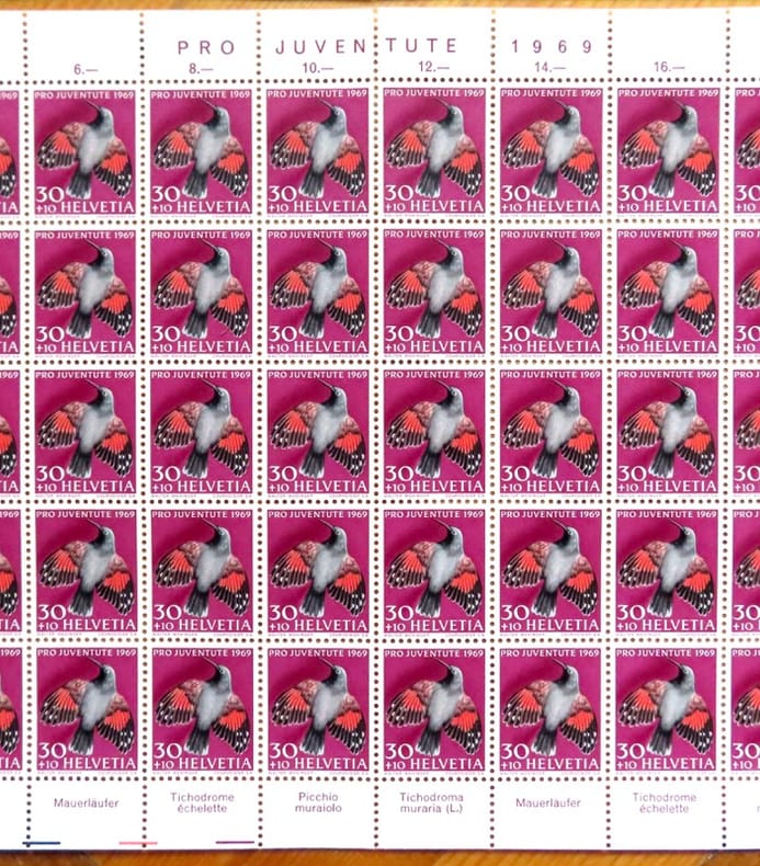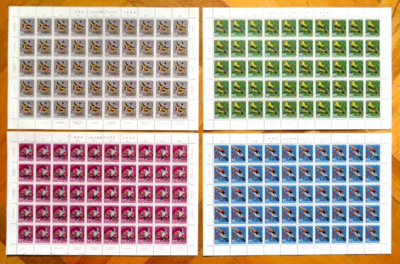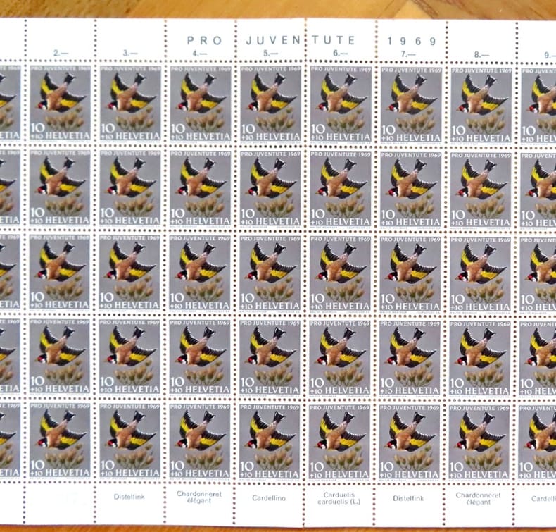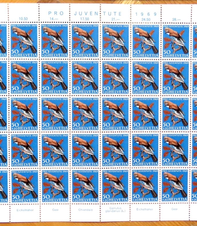 PTT, 1969. 4 feuille de 50 timbres (poste suisse), valeur faciale totale 80 francs, à l'état de neuf, non oblitérés. Tellement beaux qu'on a presque envie de les encadrer...