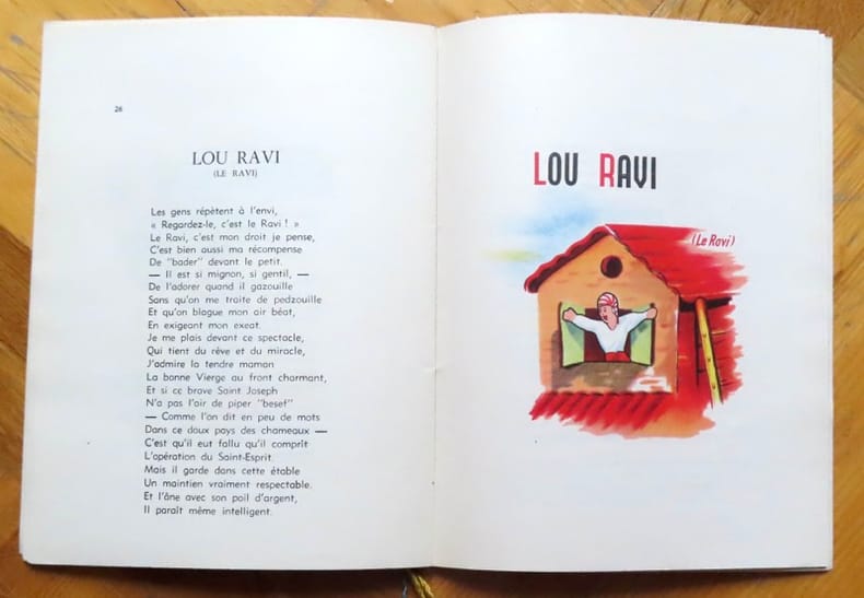 3e édition de ce recueil de poèmes à la gloire des petits santons de Provence, naïvement illustrée par Yermel et tirée sur les presses des célèbres Distilleries Ricard. (406)