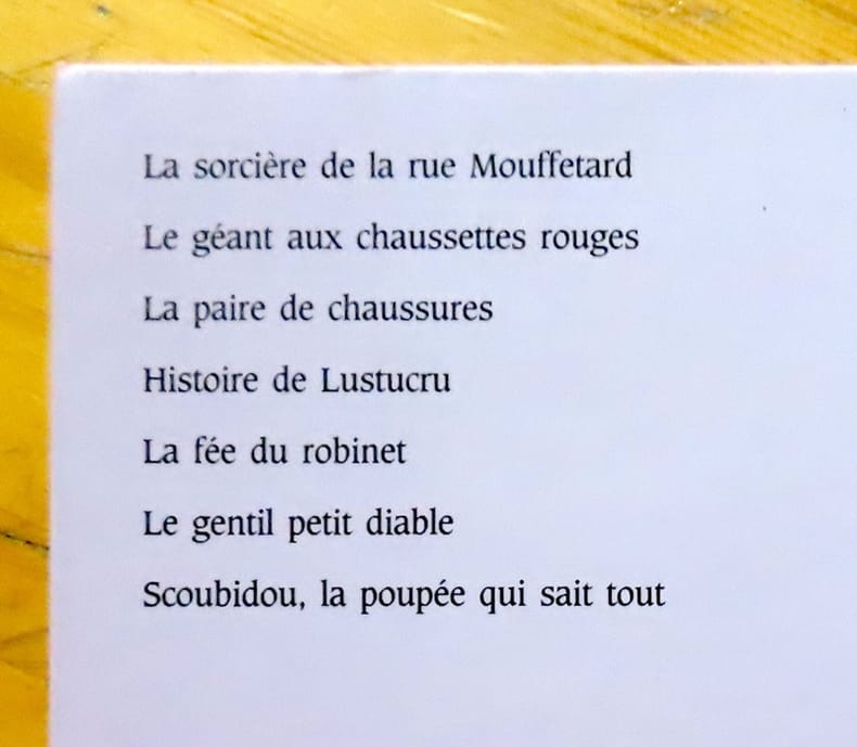 Contes de la rue Broca - la sorciere de la rue mouffetard, le geant aux chaussettes rouges, la paire de chaussures, scoubidou la poupee qui sait tout, roman d'amour d'une patate, histoire de lustucru, la fee du robinet, le gentil petit diable, la sorciere du placard a balais, la maison de l'oncle pierre, le prince blub et la sirene, le petit cochon futé, je-ne-sais-qui je-ne-sais-quoi Classification Dewey : 398.2-Conte populaire